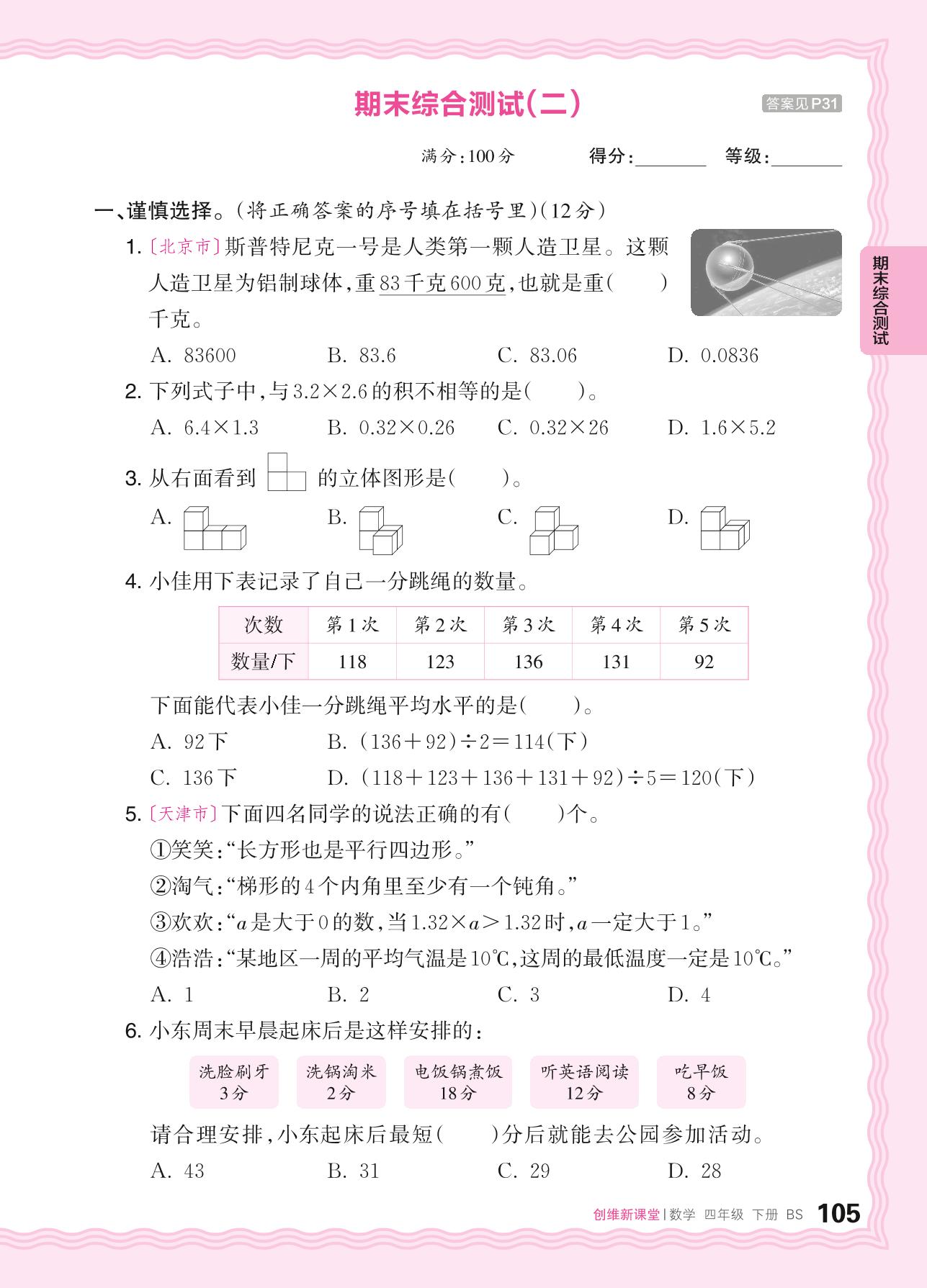 四年级数学北师版下册期末卷