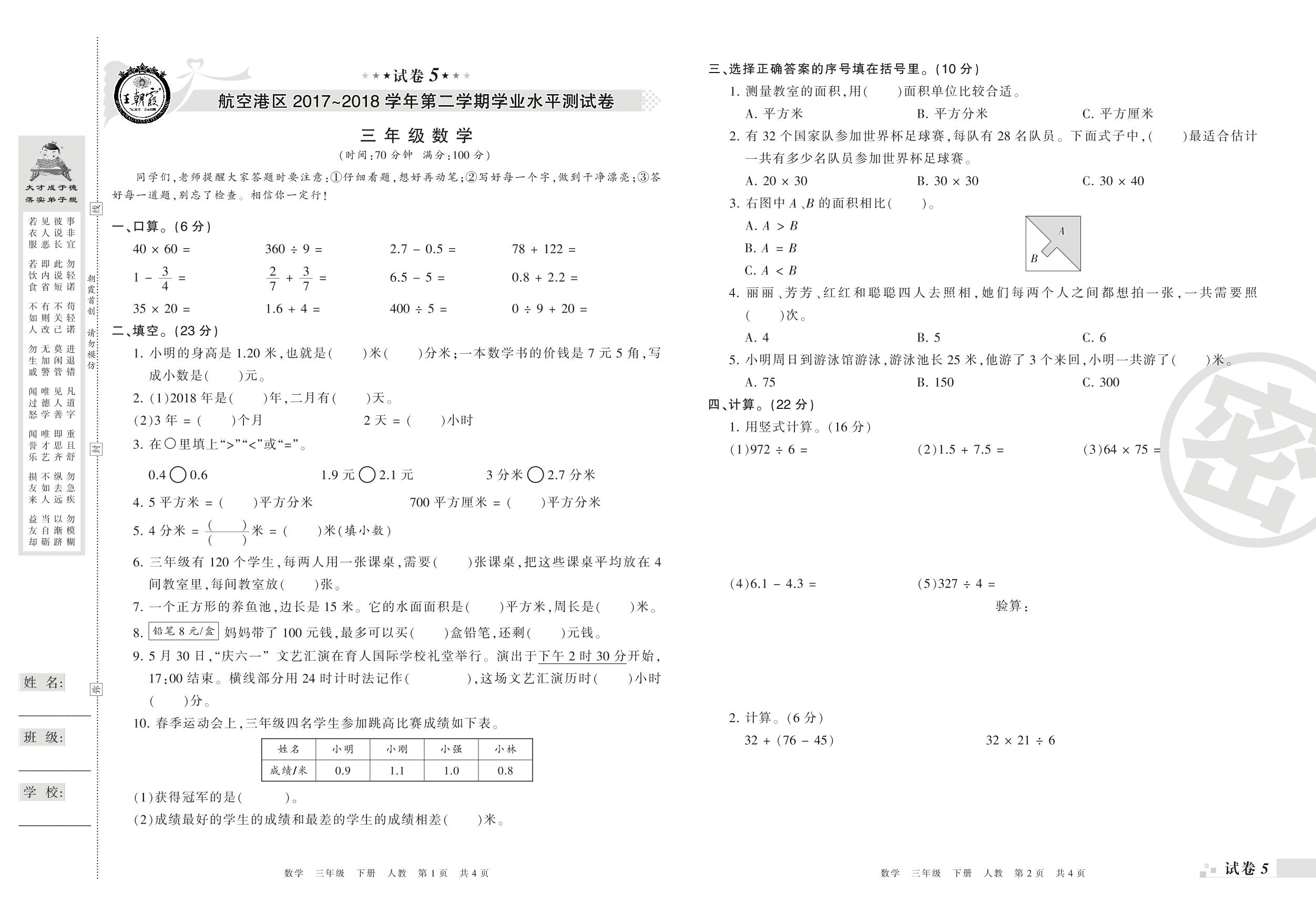 2017-2018学年第二学期郑州市航空港区三年级数学试卷(人教版)【5】