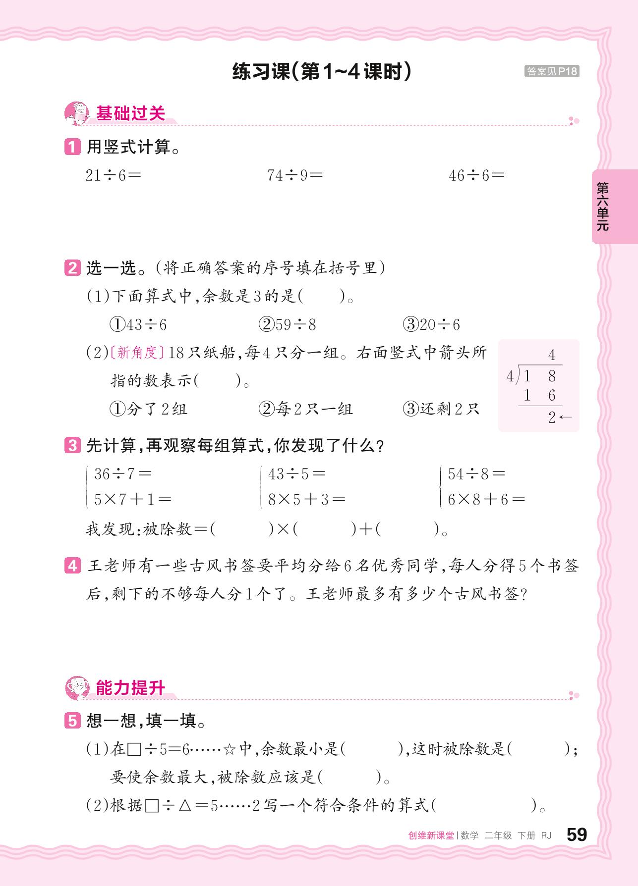 2024春下册二年级数学人教版 第六单元 有余数的除法——认识有余数的除法、余数和除数的关系、除法竖式练习课