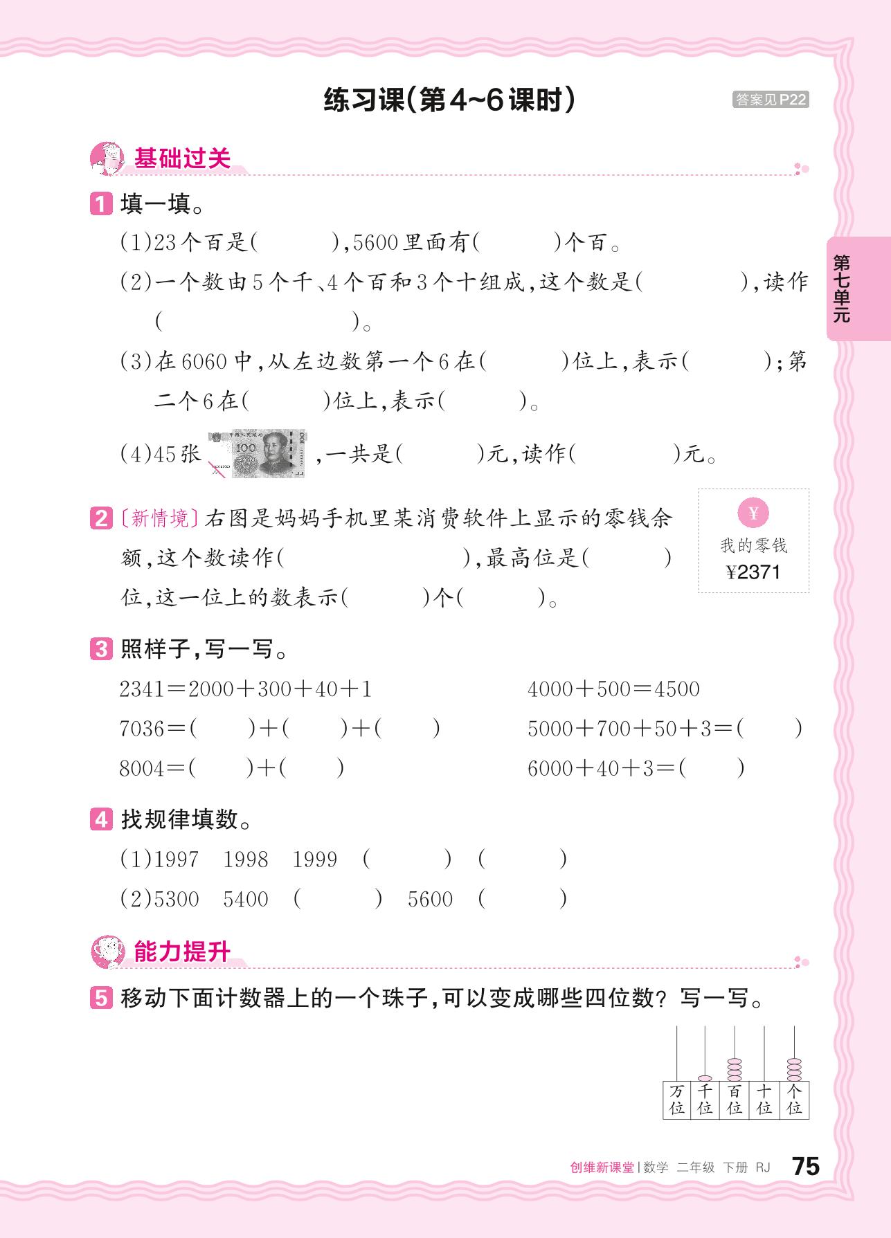 2024春下册二年级数学人教版 第七单元 万以内数的认识——10000以内数的认识、组成、读写练习课