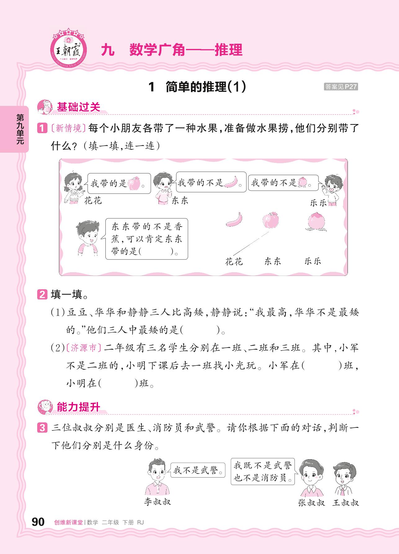 2024春下册二年级数学人教版 第九单元 数学广角 推理——1. 简单的推理(1)