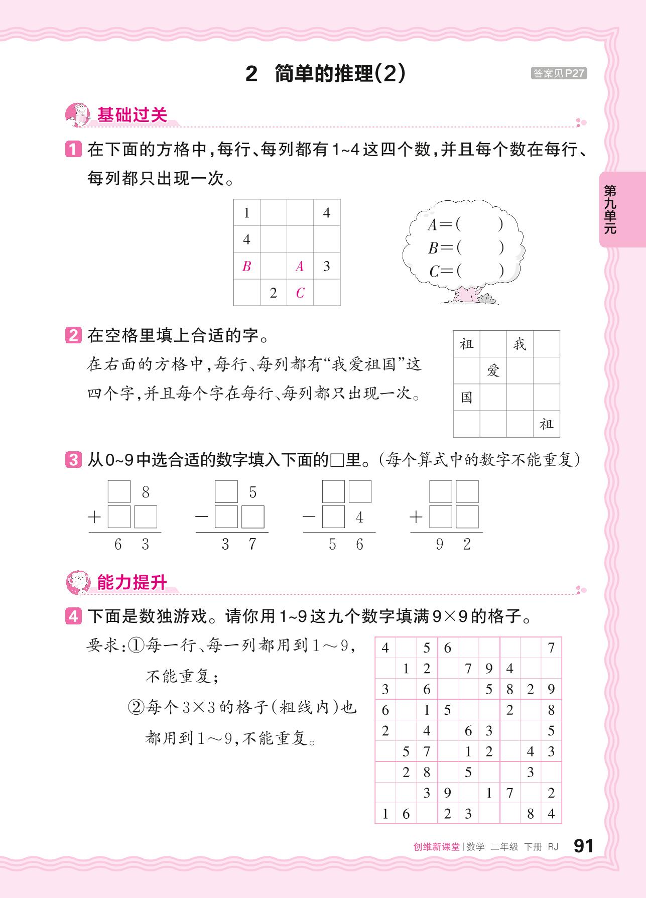 2024春下册二年级数学人教版 第九单元 数学广角 推理——2. 简单的推理(2)