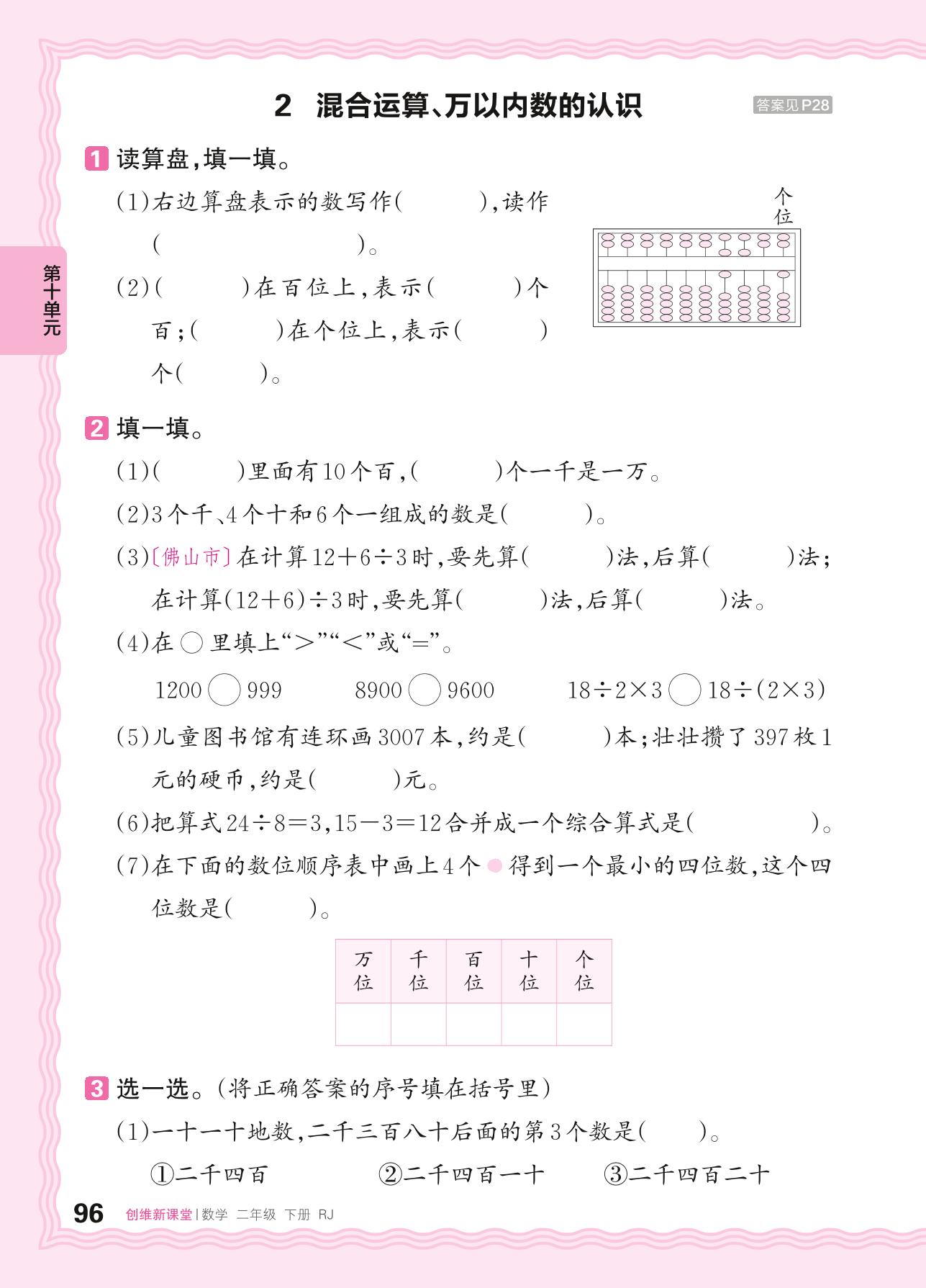 2024春下册二年级数学人教版 第十单元 总复习——2. 混合运算、万以内数的认识