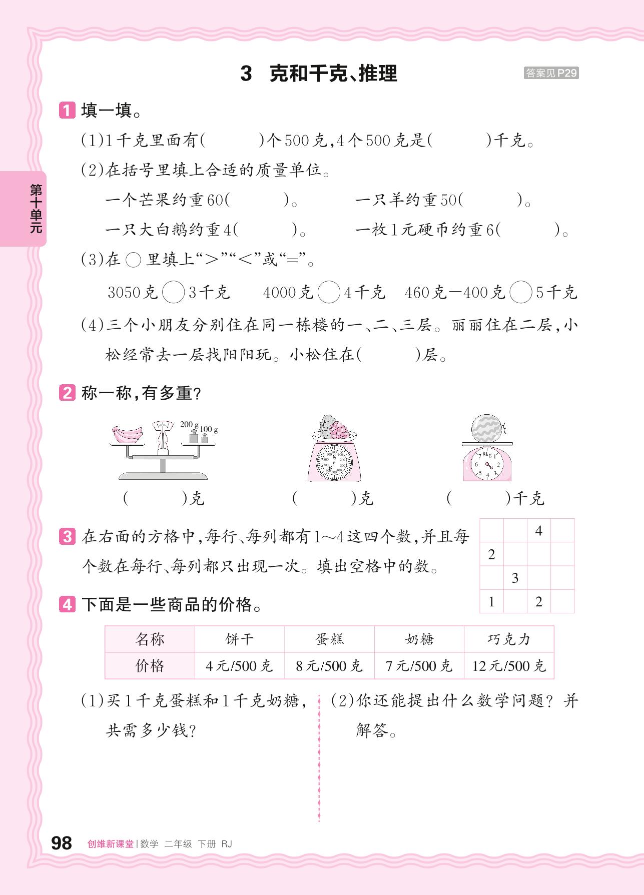 2024春下册二年级数学人教版 第十单元 总复习——3. 克和千克、推理