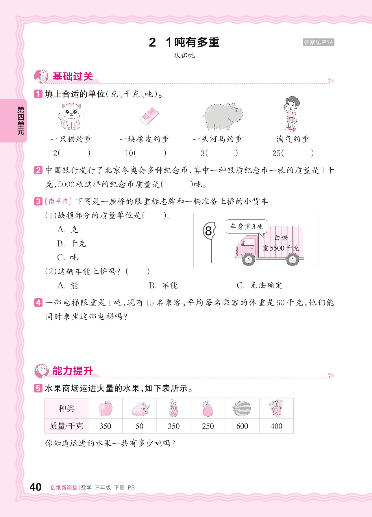 2024春下册三年级数学北师版 第四单元 千克、克、吨——2. 1吨有多重