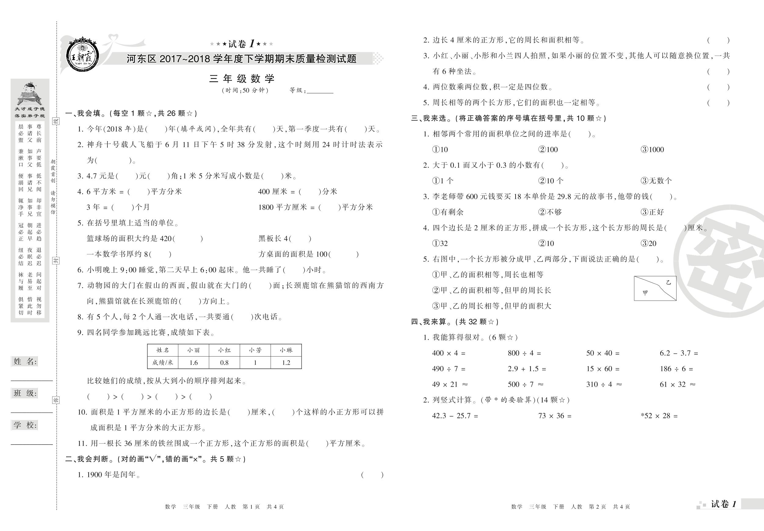 2017-2018学年第二学期临沂市河东区三年级数学试卷(人教版)【1】