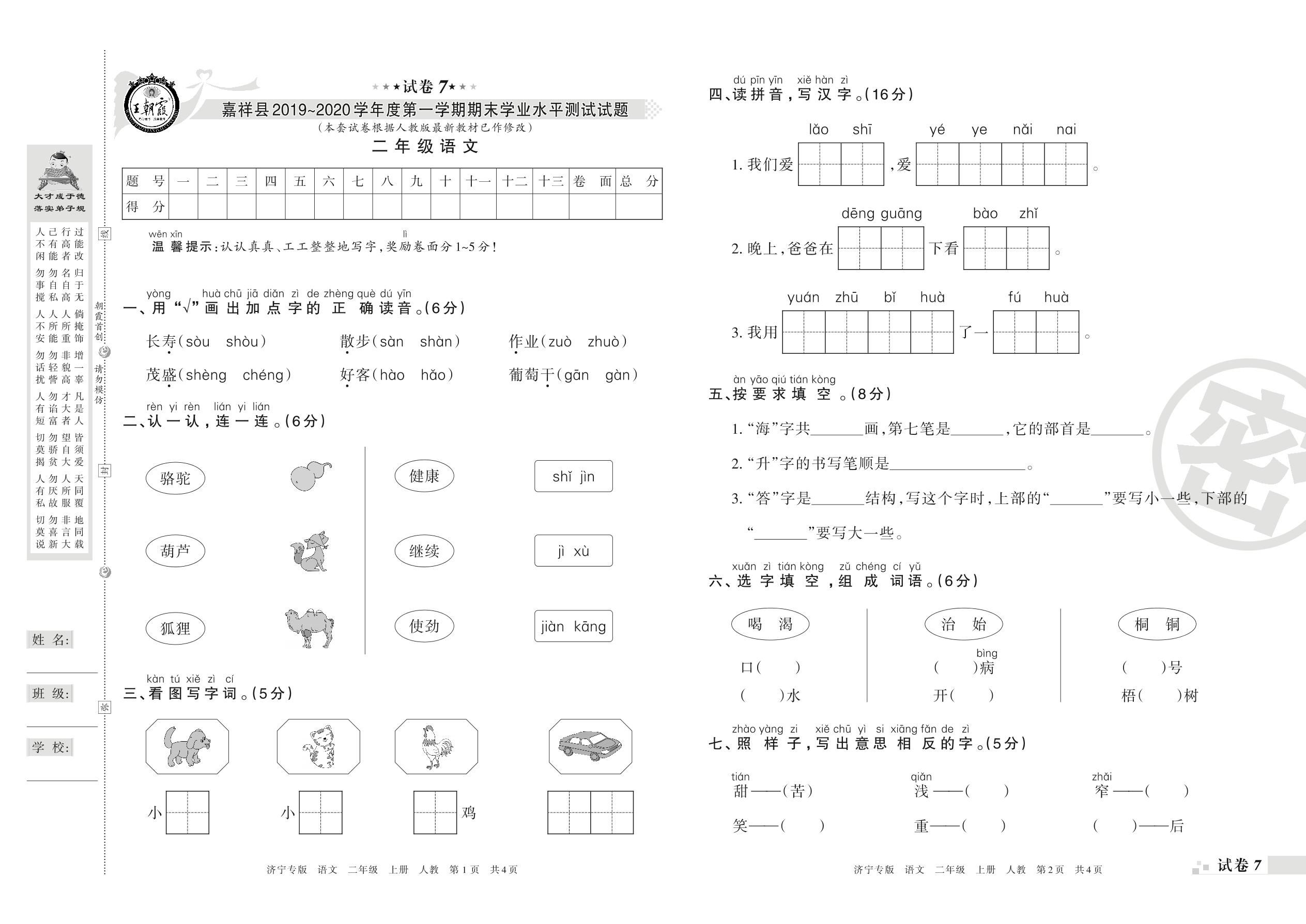 2019-2020学年第一学期济宁市嘉祥县二年级语文试卷(人教版)【7】