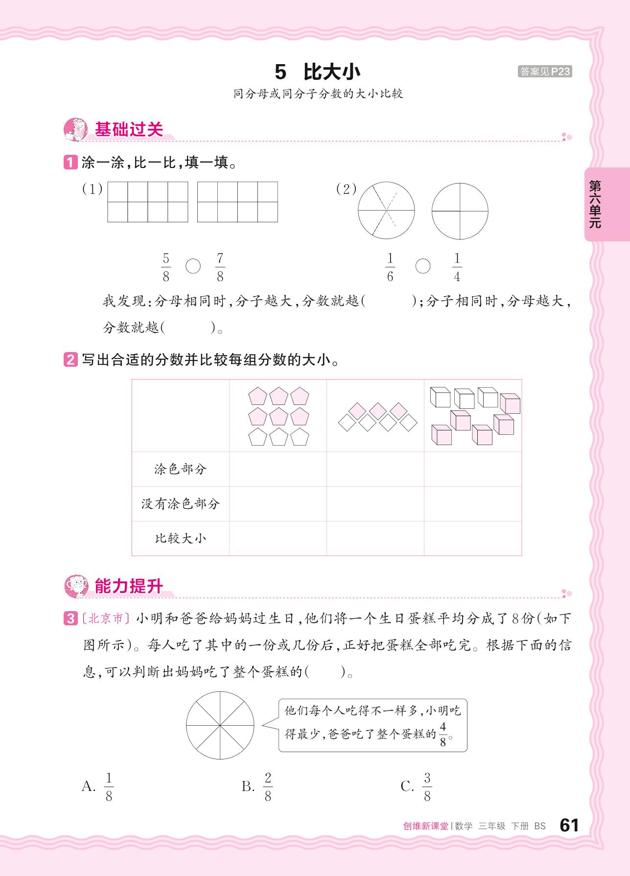 2024春下册三年级数学北师版 第六单元 认识分数——5. 比大小