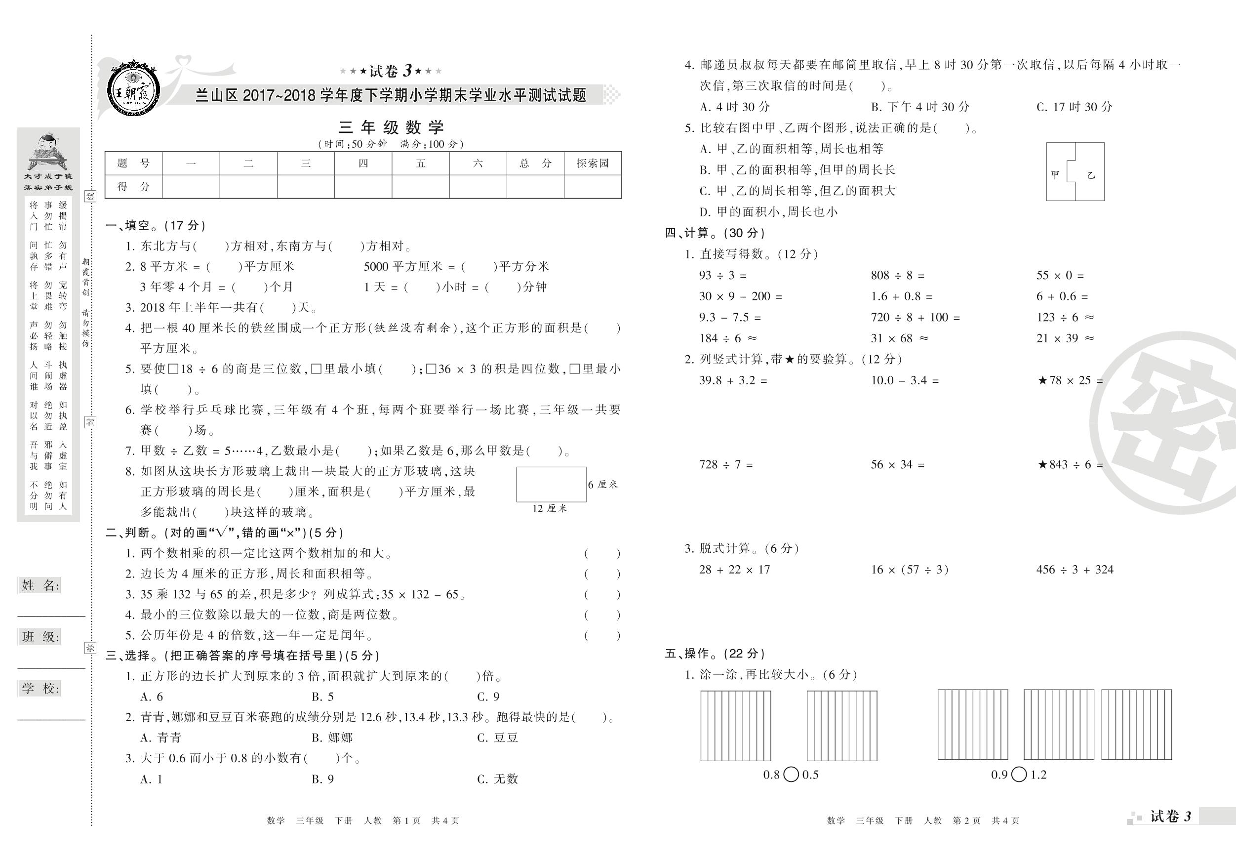 2017-2018学年第二学期临沂市兰山区三年级数学试卷(人教版)【3】