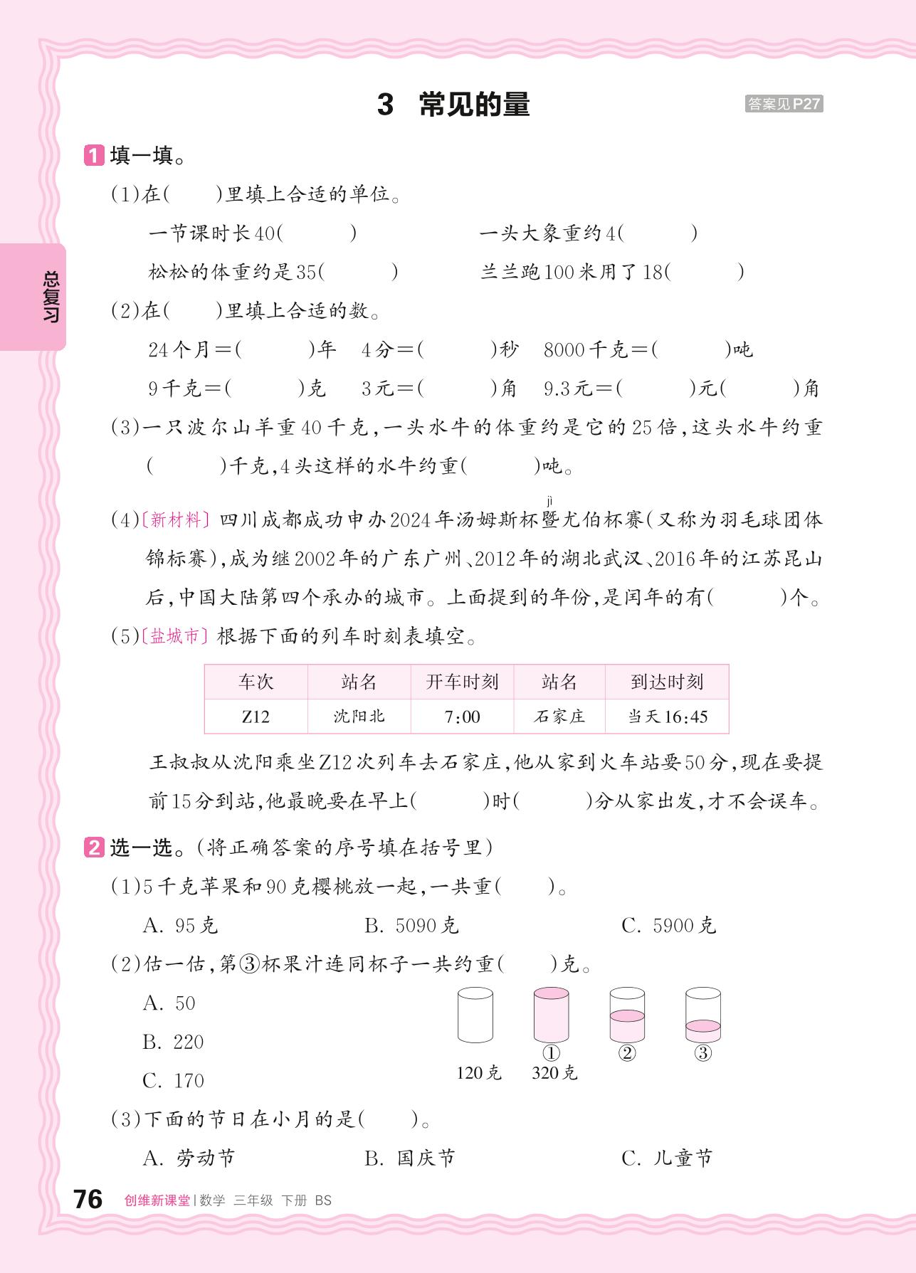 2024春下册三年级数学北师版 总复习——3. 常见的量
