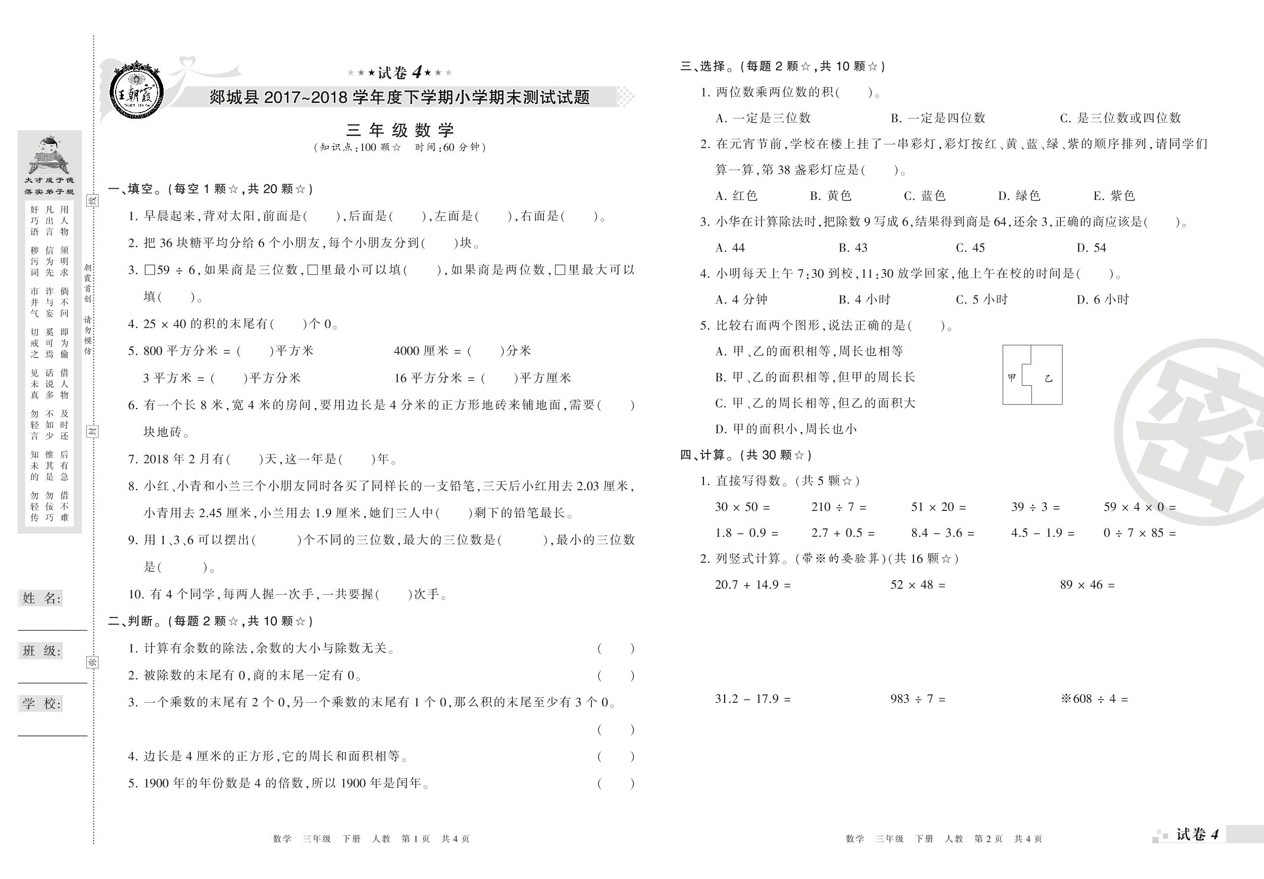 2017-2018学年第二学期临沂市郯城县三年级数学试卷(人教版)【4】