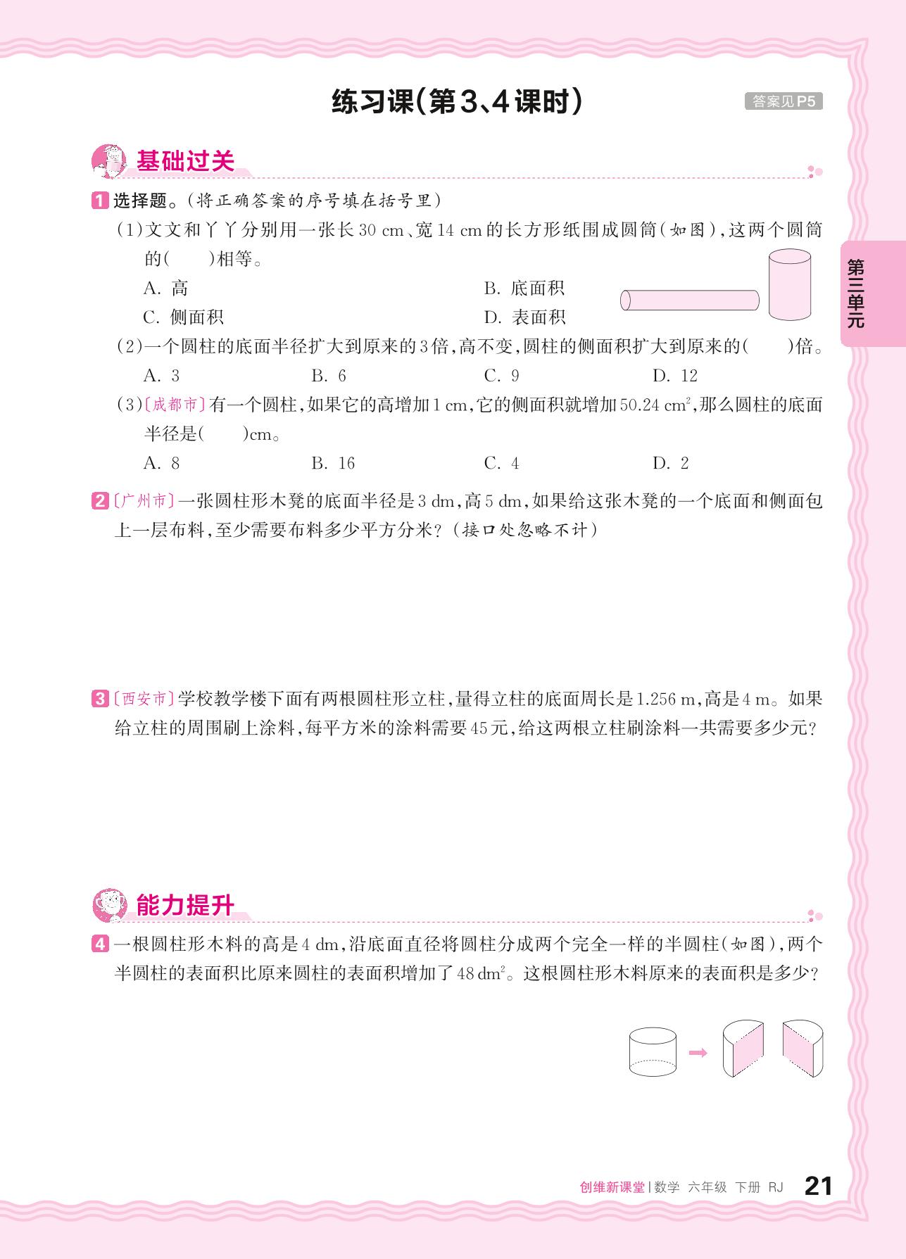 2024春下册六年级数学人教版 第三单元 圆柱与圆锥——圆柱的认识、圆柱的表面积练习课