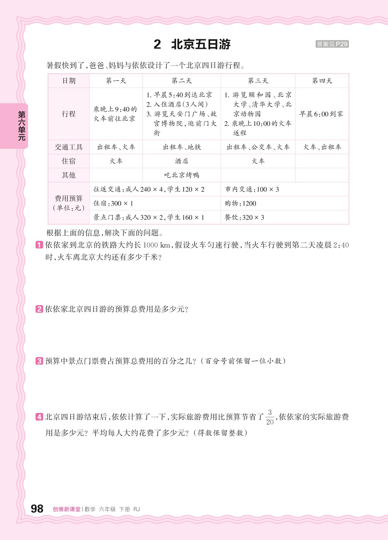 2024春下册六年级数学人教版 第六单元 整理和复习(综合与实践)——2. 北京五日游