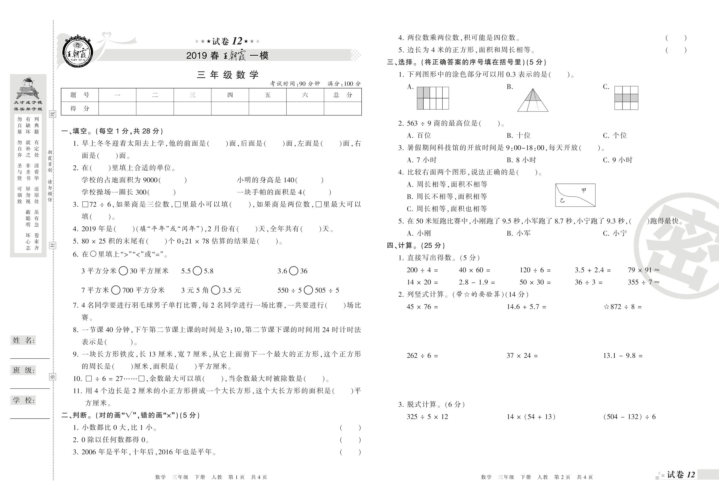 王朝霞期末模拟卷三年级下册数学(人教版)【12】