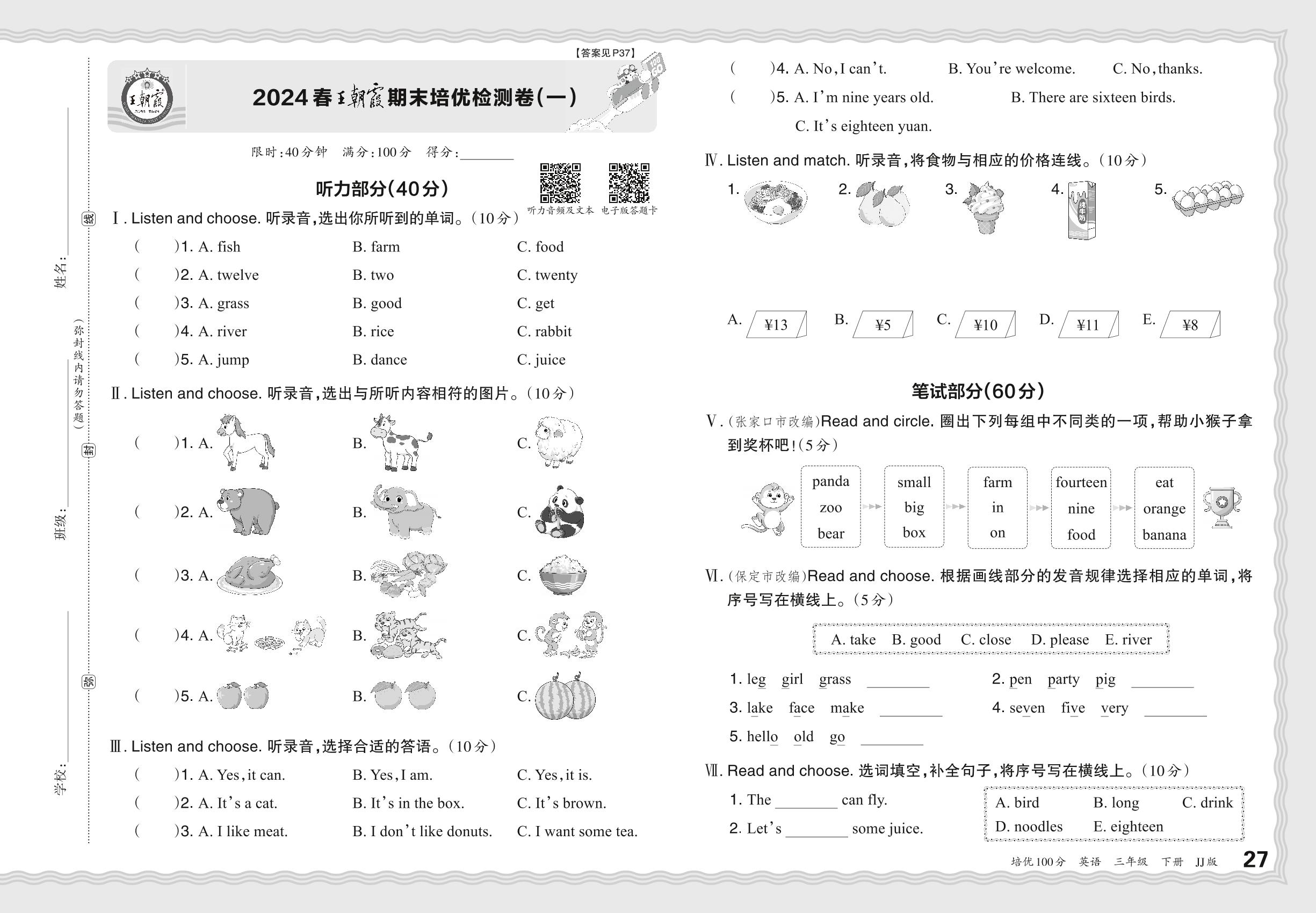 2024春下册三年级英语冀教版 王朝霞期末培优检测卷(一)