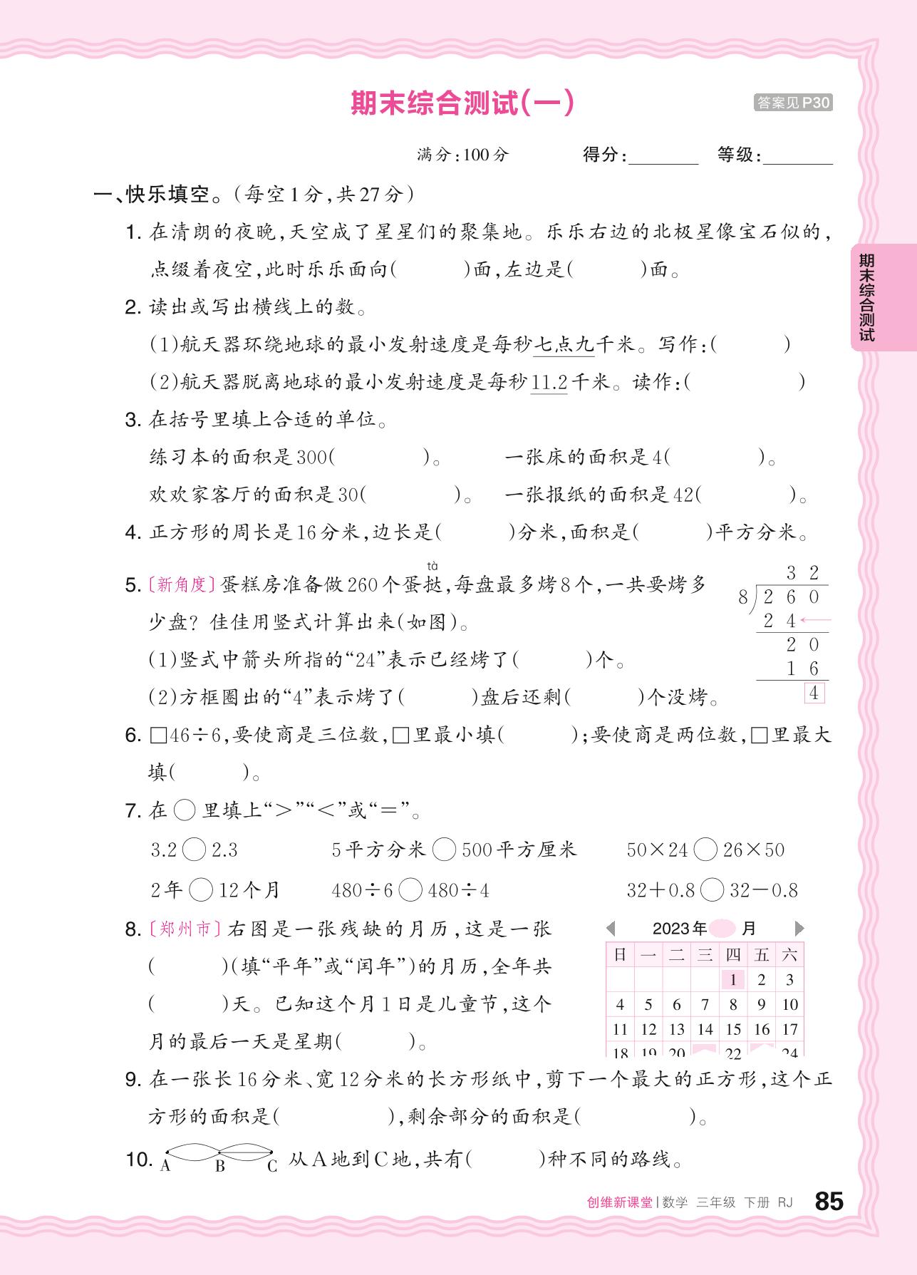 2024春下册三年级数学人教版 期末综合测试(一)