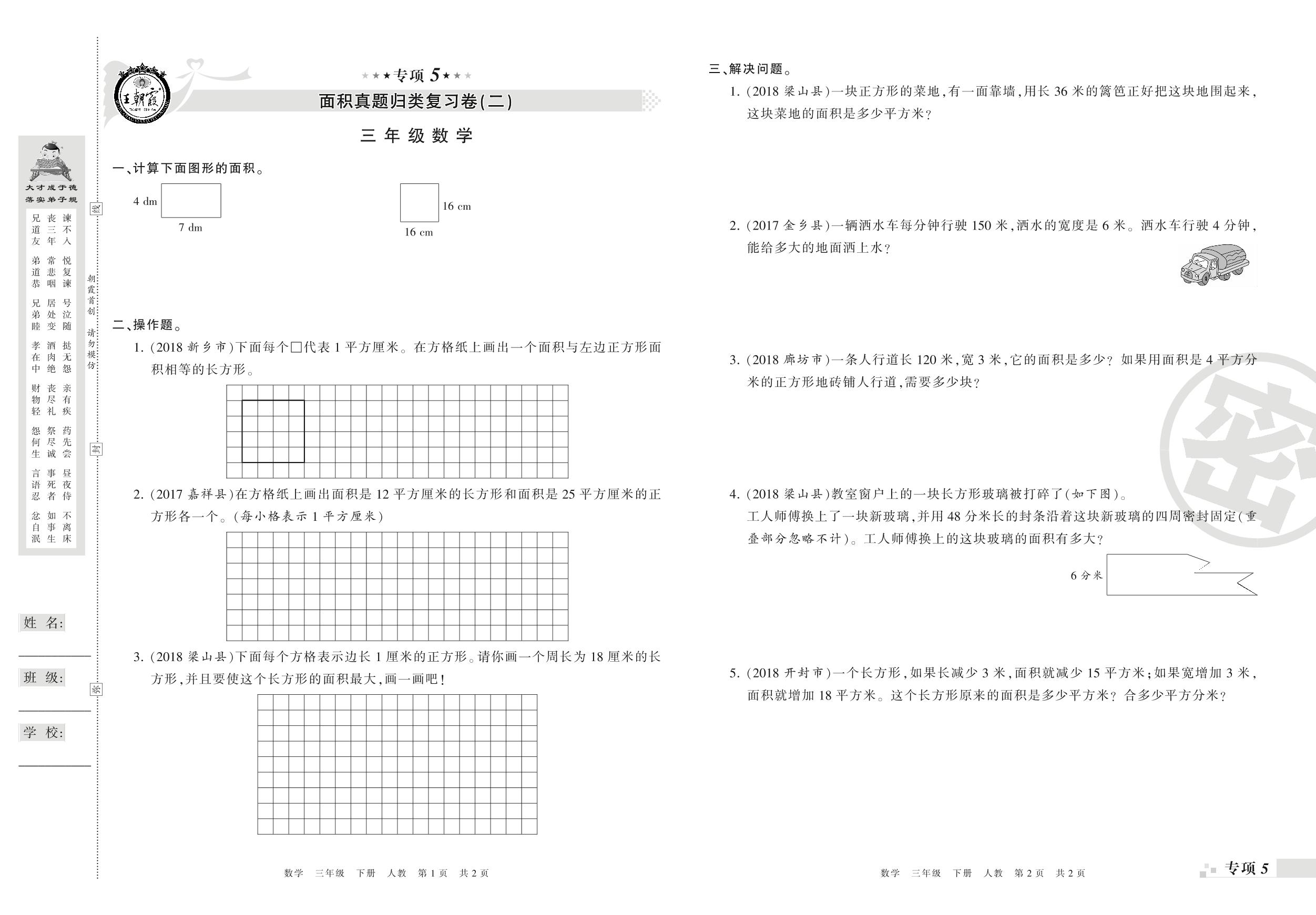 王朝霞期末专项卷——面积(二) 年、月、日真题归类复习卷三年级下册数学(人教版)_R210804102540【0】