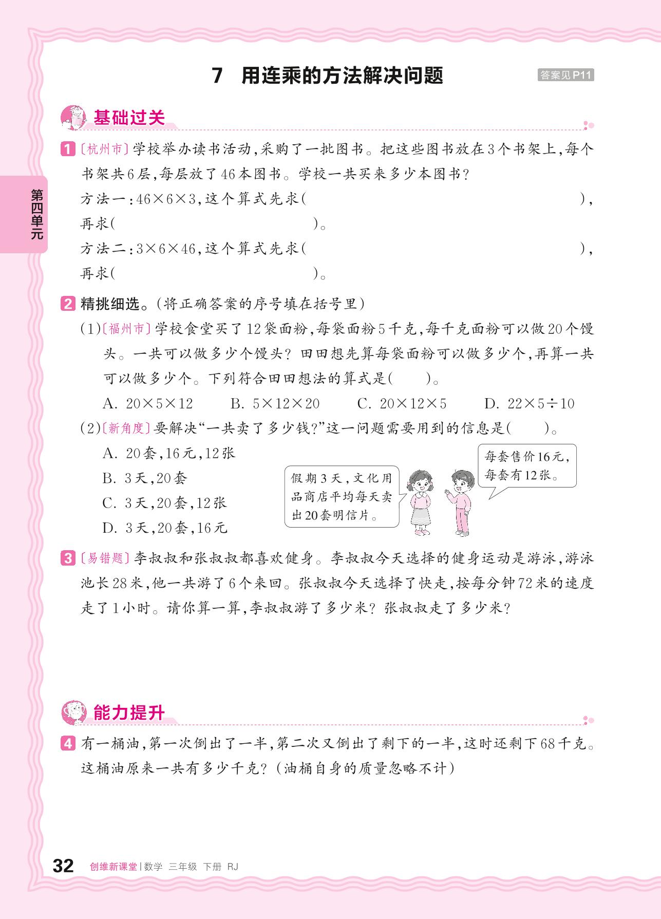2024春下册三年级数学人教版 第四单元 两位数乘两位数——7. 用连乘的方法解决问题