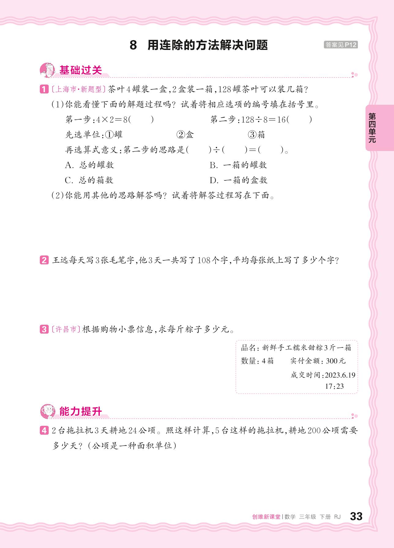 2024春下册三年级数学人教版 第四单元 两位数乘两位数——8. 用连除的方法解决问题
