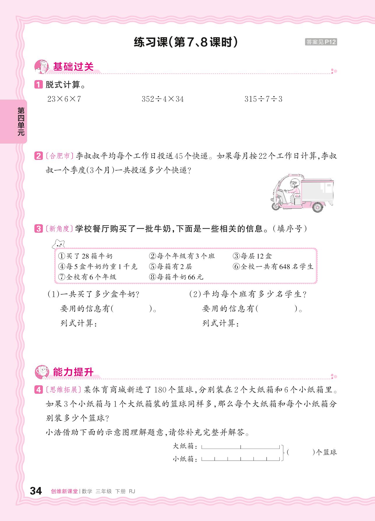 2024春下册三年级数学人教版 第四单元 两位数乘两位数——用连乘(连除)的方法解决问题练习课