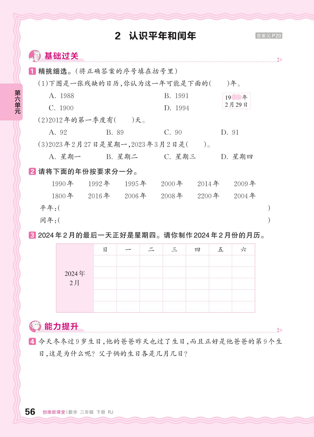 2024春下册三年级数学人教版 第六单元 年、月、日——2. 认识平年和闰年_R240122172513918