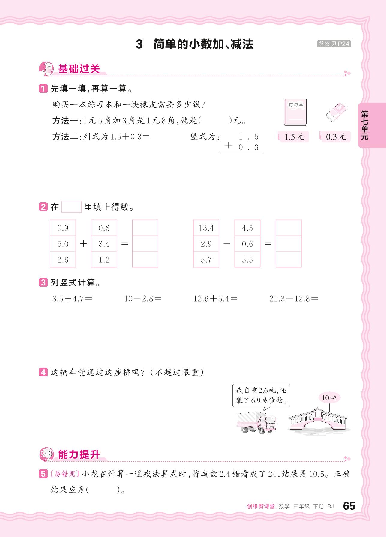 2024春下册三年级数学人教版 第七单元 小数的初步认识——3. 简单的小数加、减法_R240122172518579