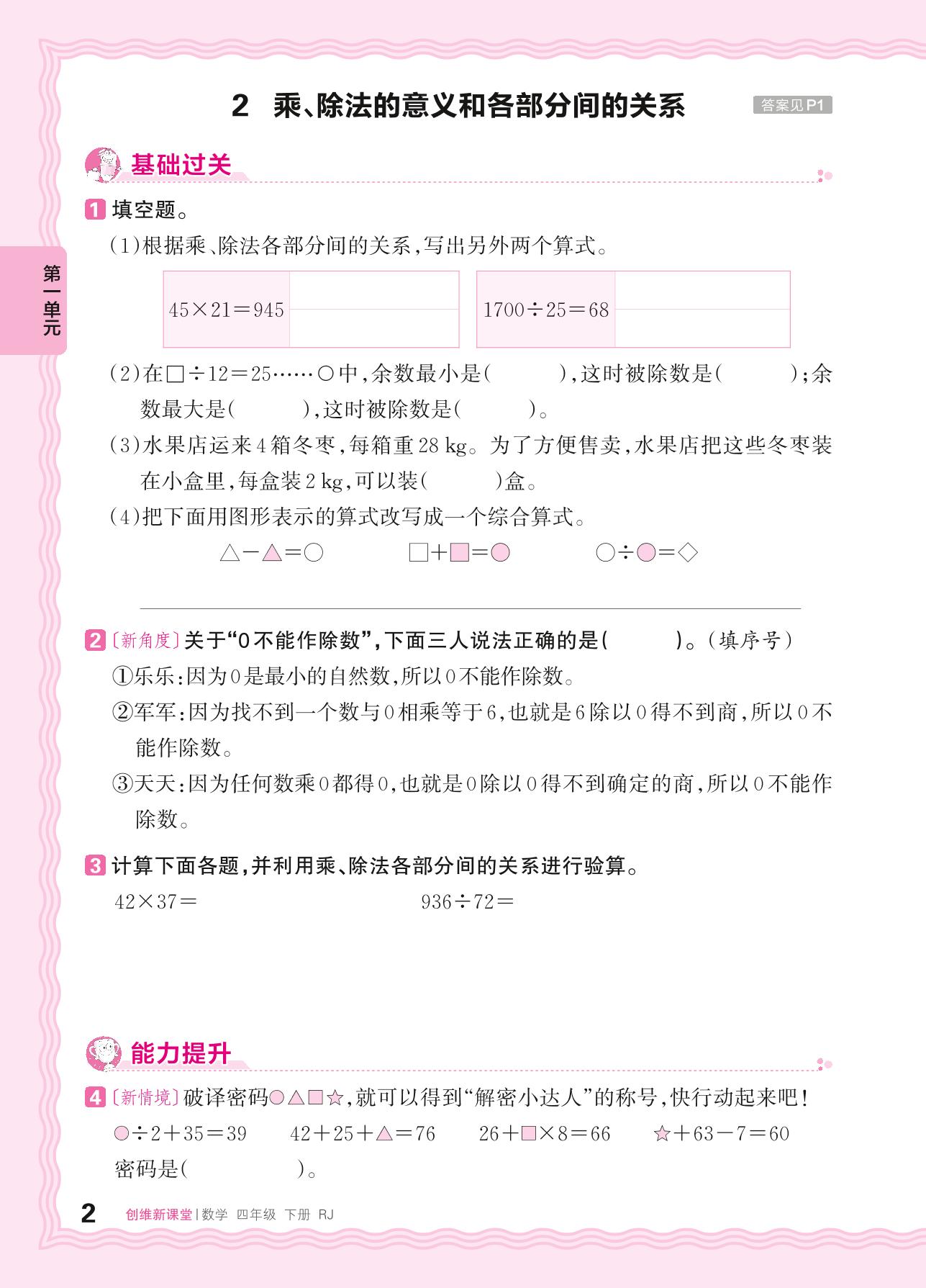 2024春下册四年级数学人教版 第一单元 四则运算——2. 乘、除法的意义和各部分间的关系_R240122173905202