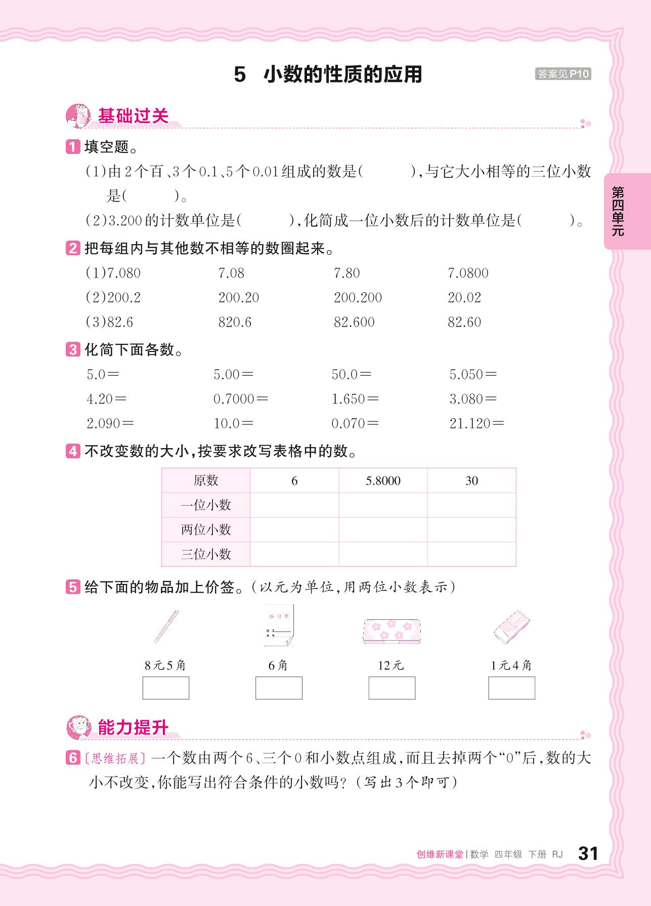 2024春下册四年级数学人教版 第四单元 小数的意义和性质——5. 小数的性质的应用