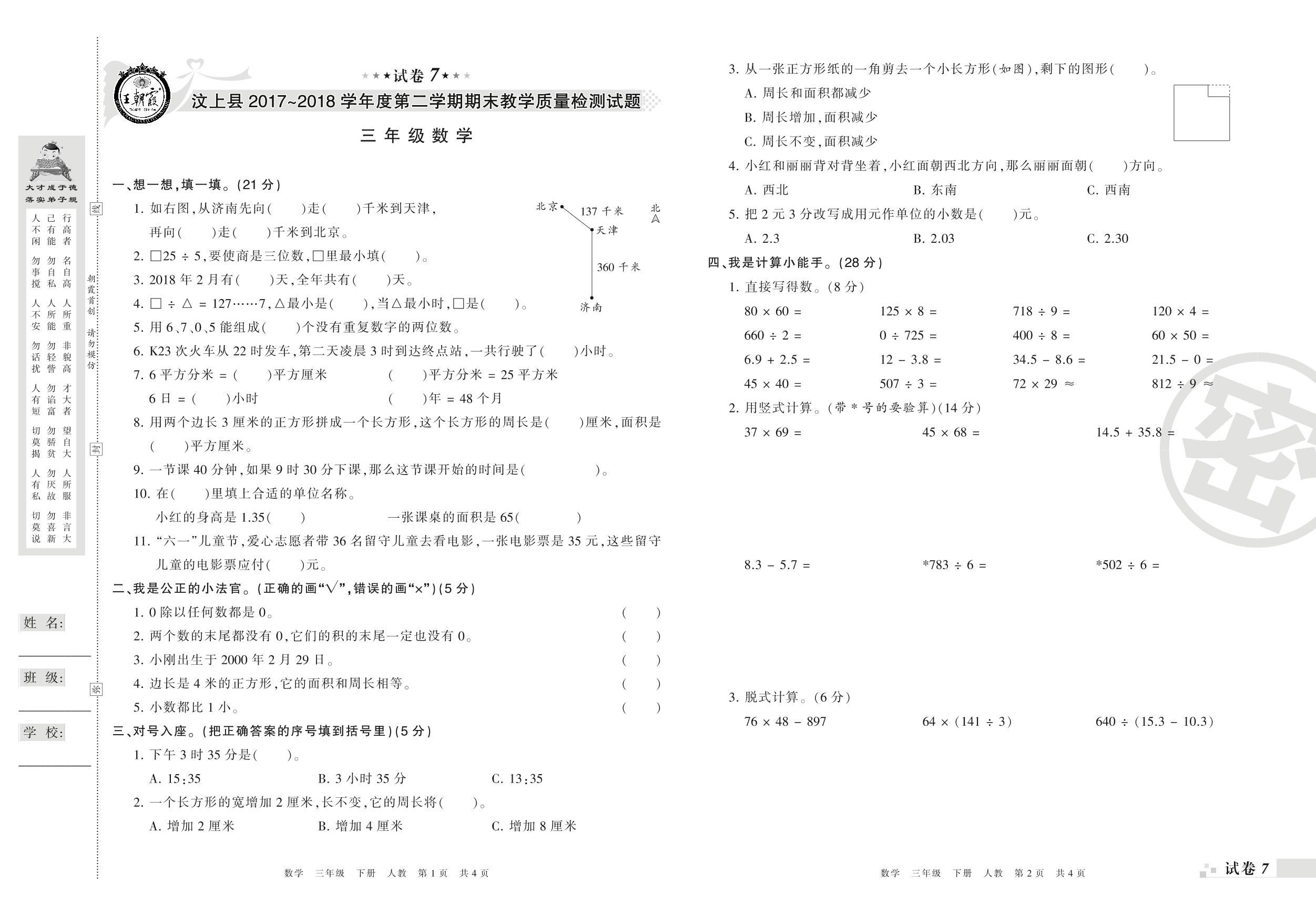 2017-2018学年第二学期济宁市汶上县三年级数学试卷(人教版)【7】