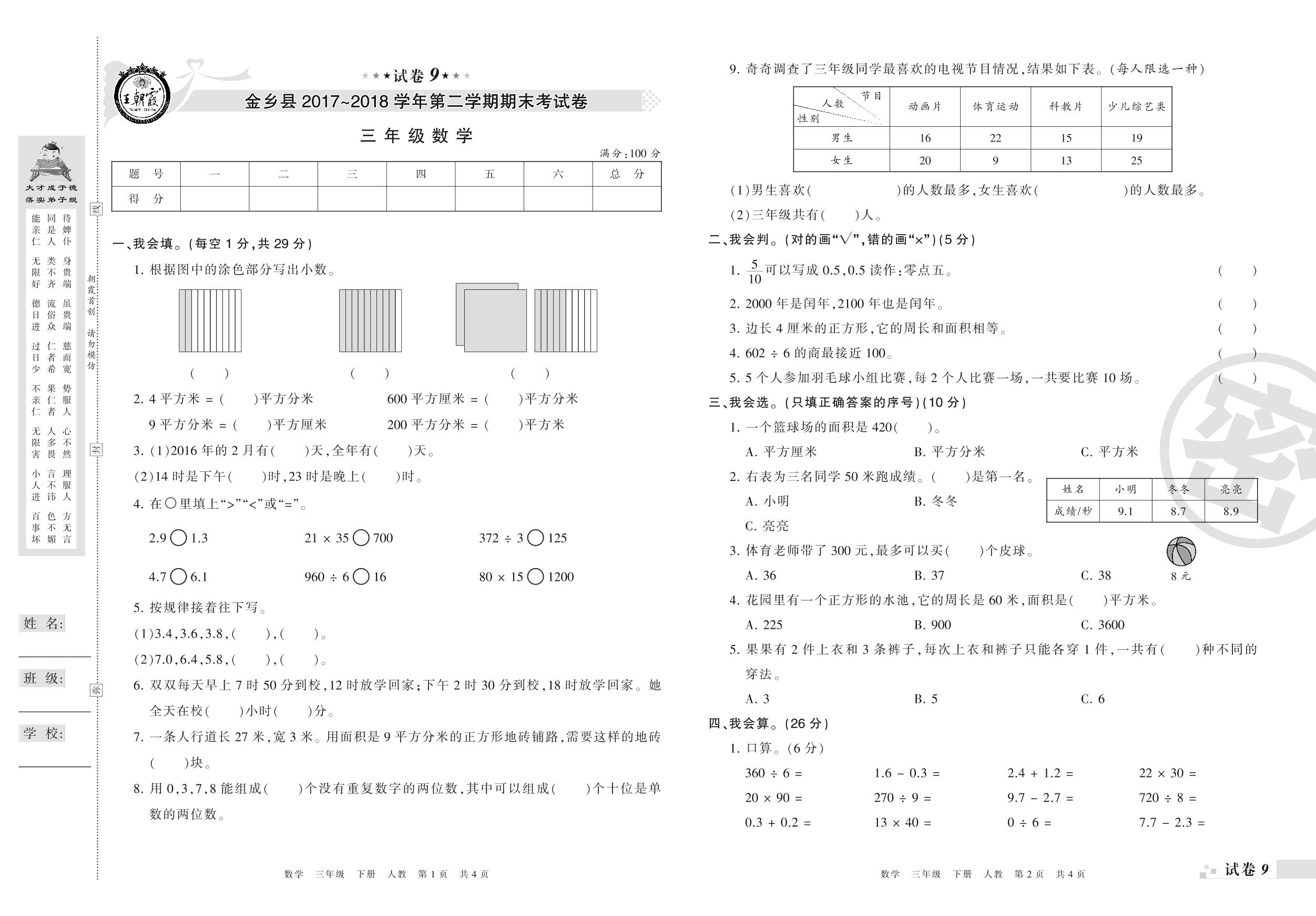 2017-2018学年第二学期济宁市金乡县三年级数学试卷(人教版)【9】