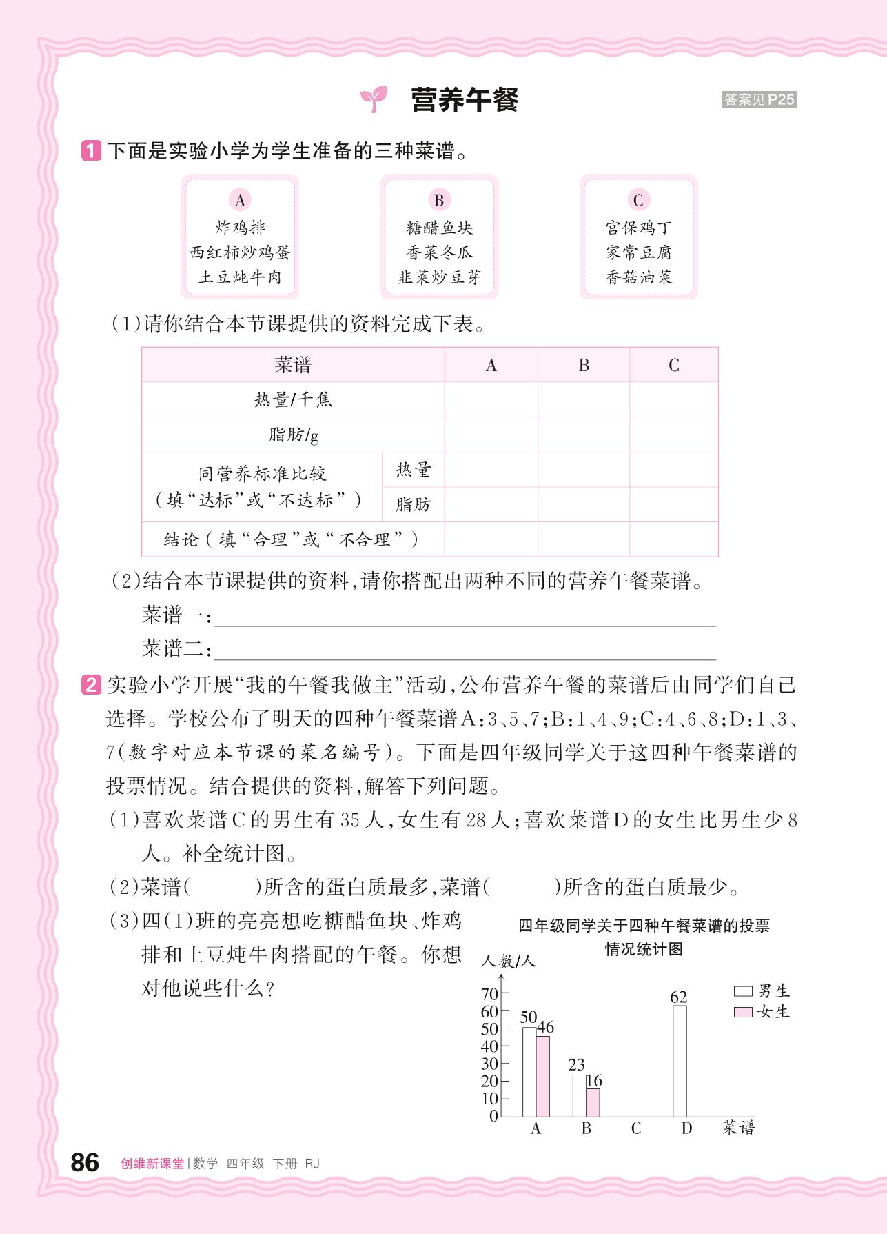 2024春下册四年级数学人教版 第八单元 平均数与条形统计图——营养午餐