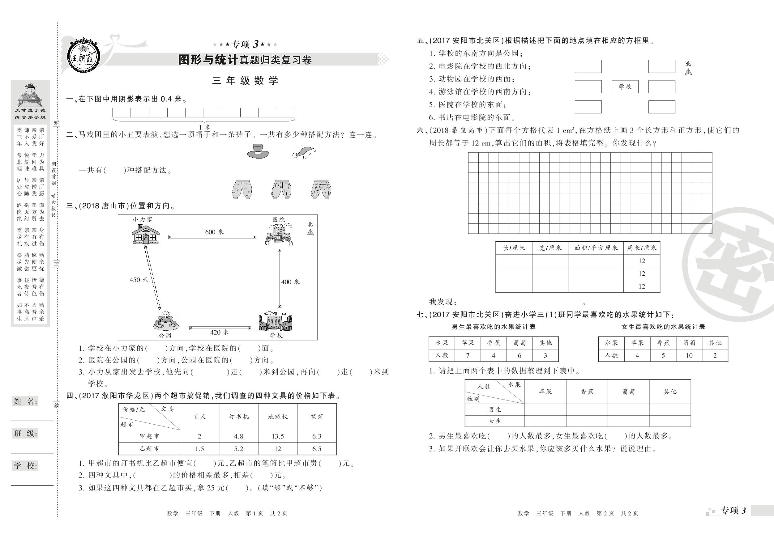 王朝霞期末专项卷——图形与统计、解决问题真题归类复习卷三年级下册数学(人教版)_R210804102703【0】