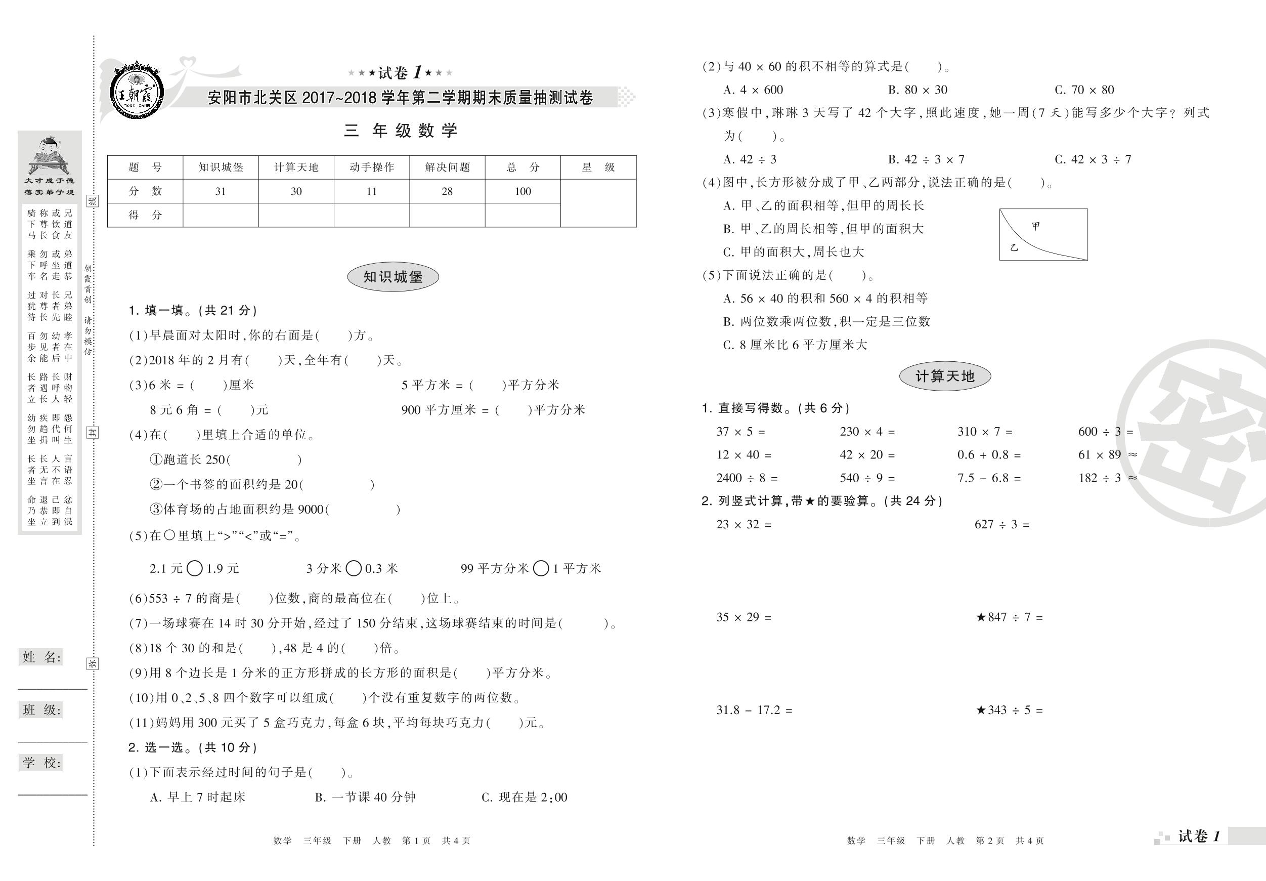 2017-2018学年第二学期安阳市北关区三年级数学试卷(人教版)【1】