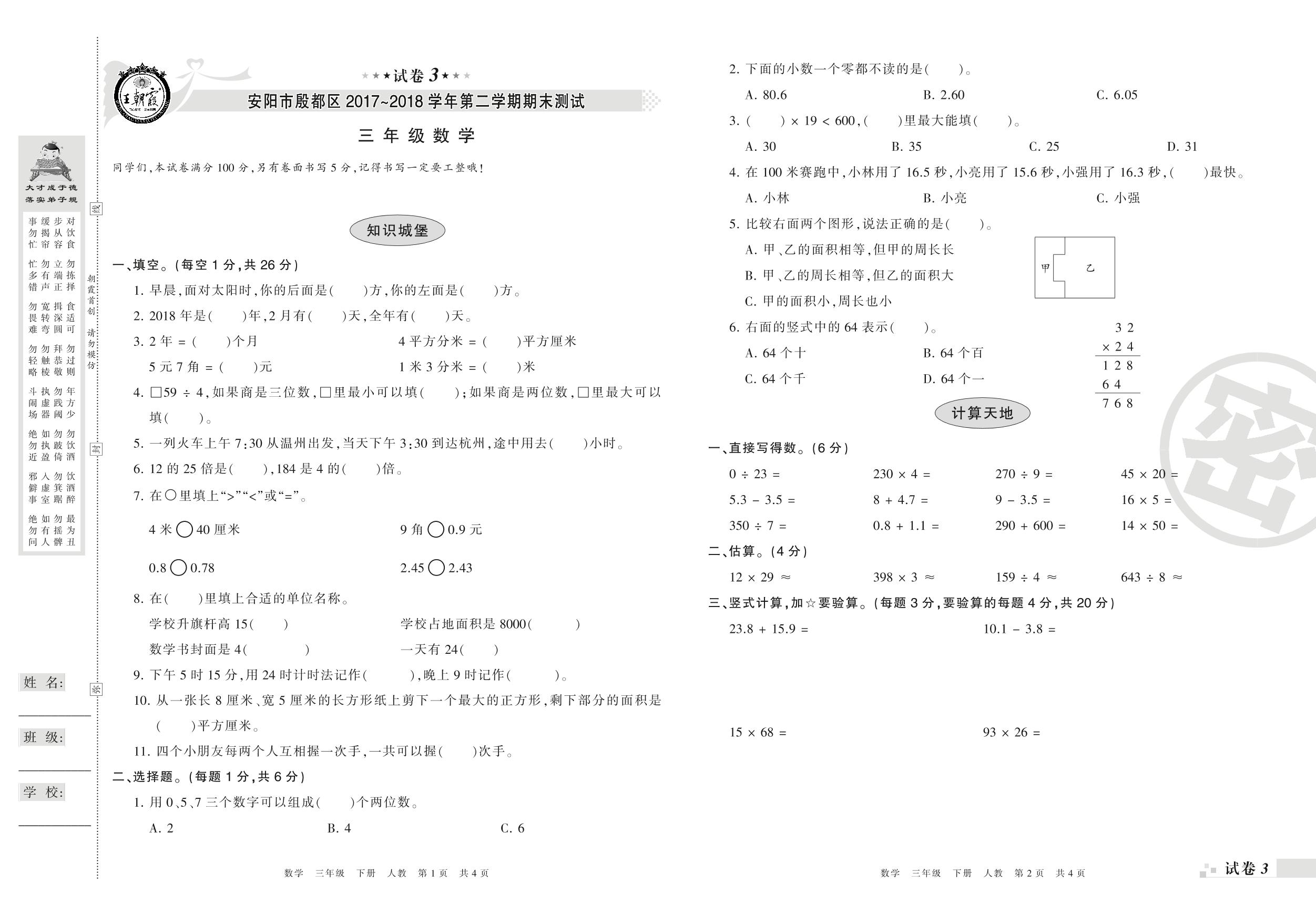 2017-2018学年第二学期安阳市殷都区三年级数学试卷(人教版)【3】