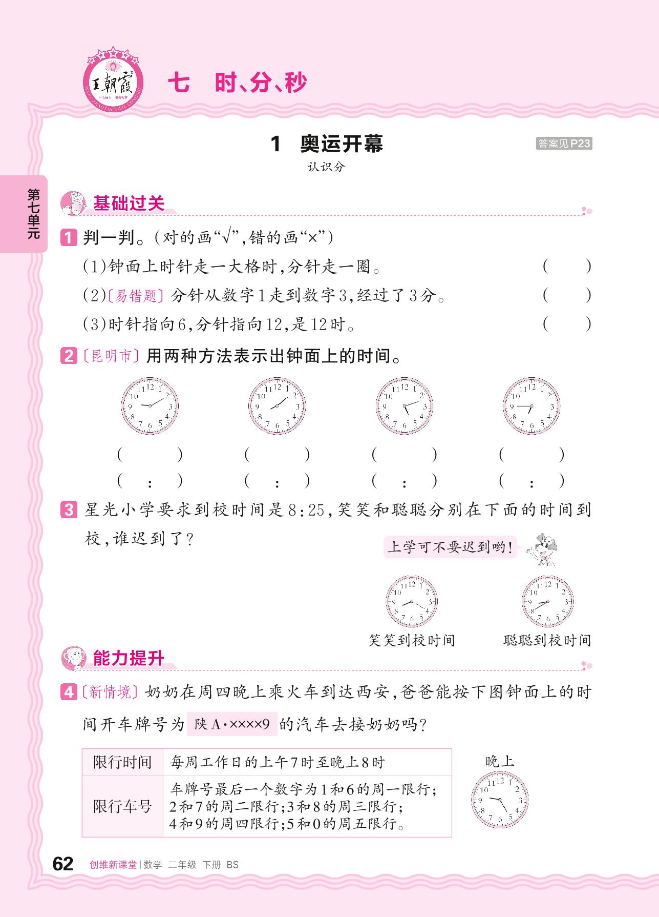 2024春下册二年级数学北师版 第七单元 时、分、秒——1. 奥运开幕