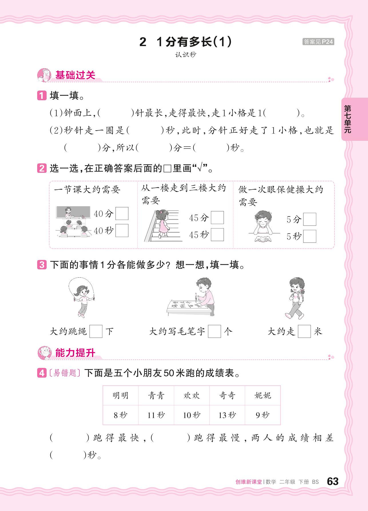 2024春下册二年级数学北师版 第七单元 时、分、秒——2. 1分有多长(1)