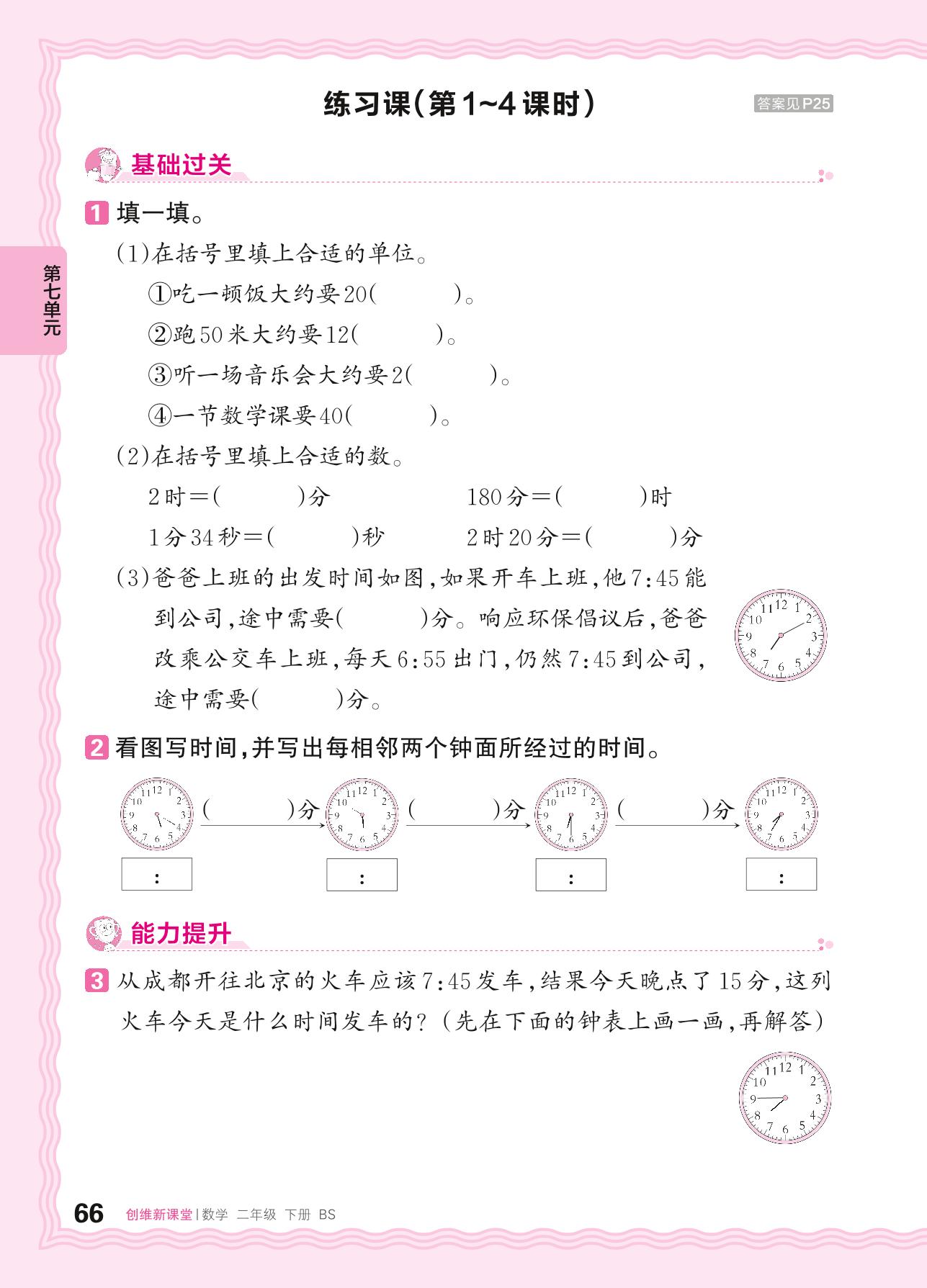 2024春下册二年级数学北师版 第七单元时、分、秒练习课