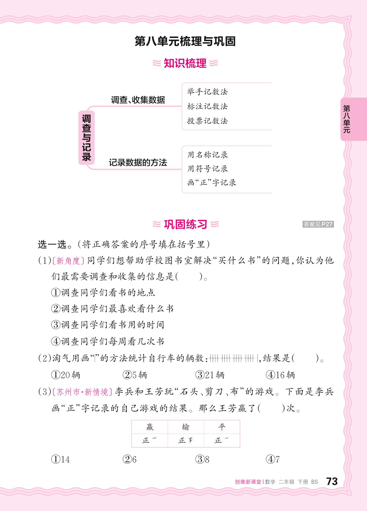 2024春下册二年级数学北师版 第八单元梳理与巩固