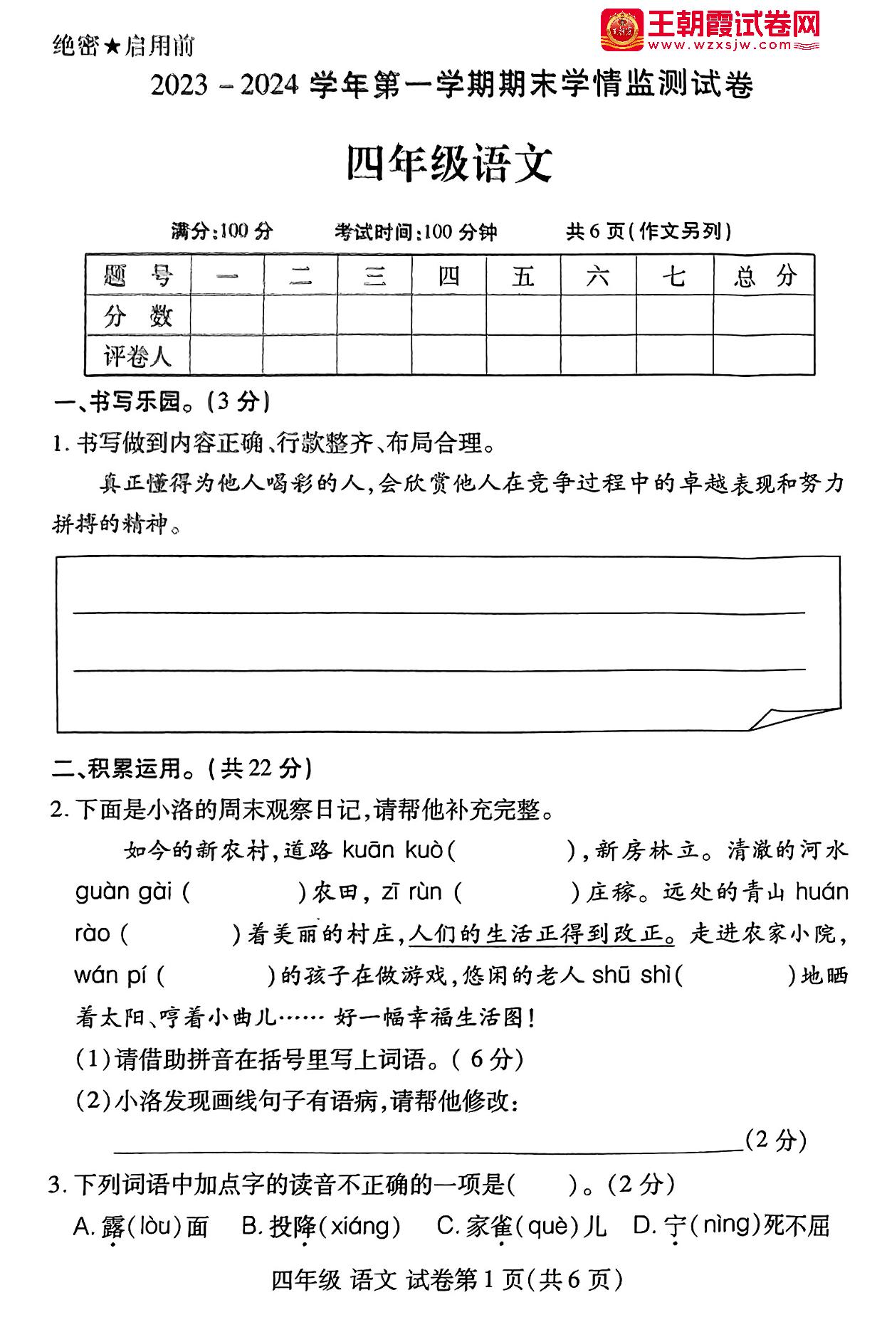 河南省洛阳市伊滨区2023-2024学年第一学期期末学情质量监测试卷四年级语文(人教版)
