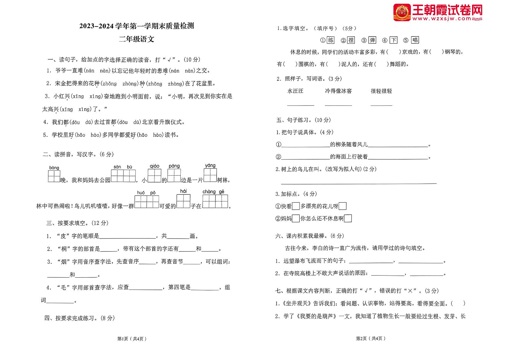 河南省洛阳市偃师区2023-2024学年第一学期期末质量检测试题二年级语文(人教版)