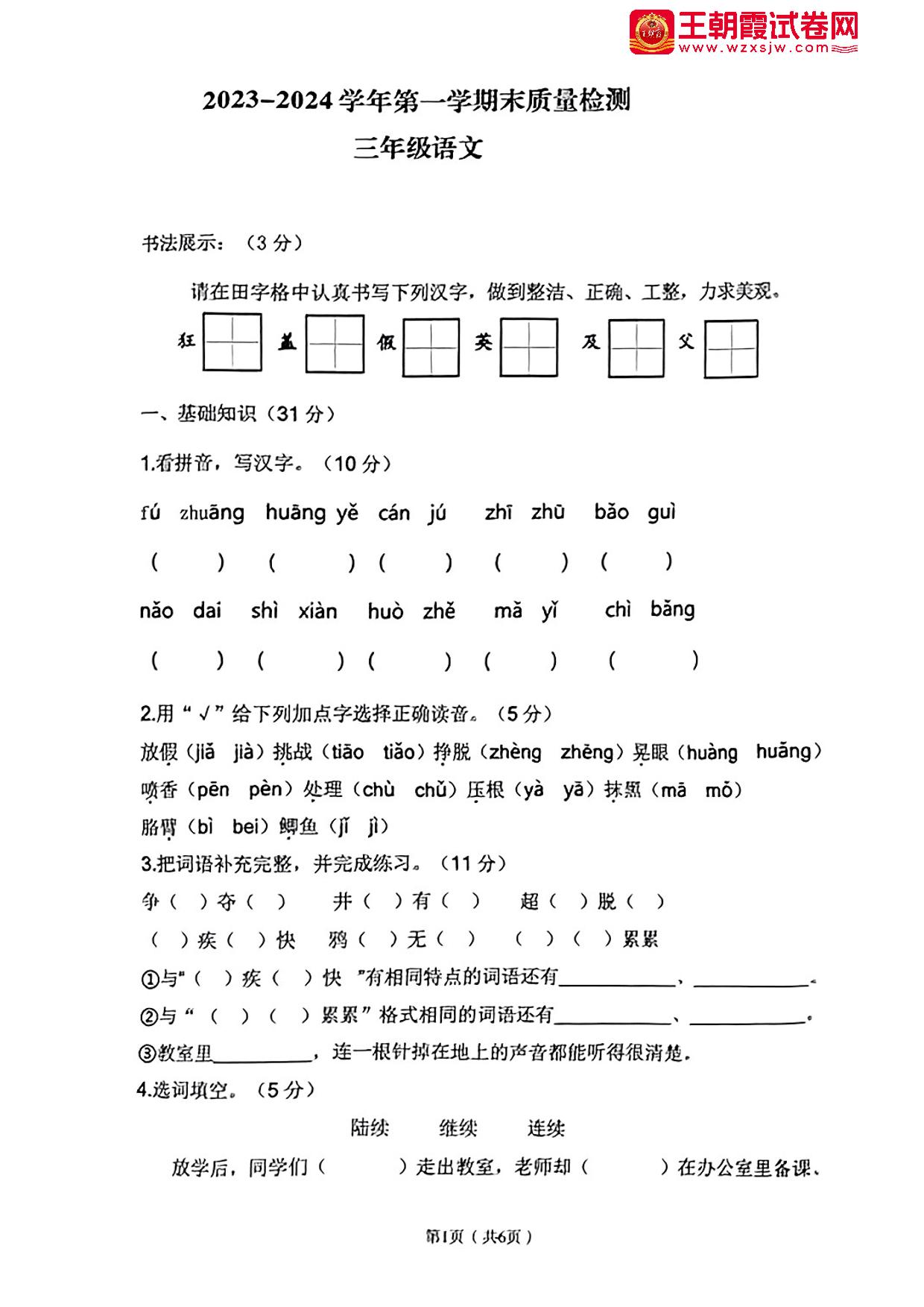 河南省洛阳市偃师区2023-2024学年第一学期期末质量检测试题三年级语文(人教版)