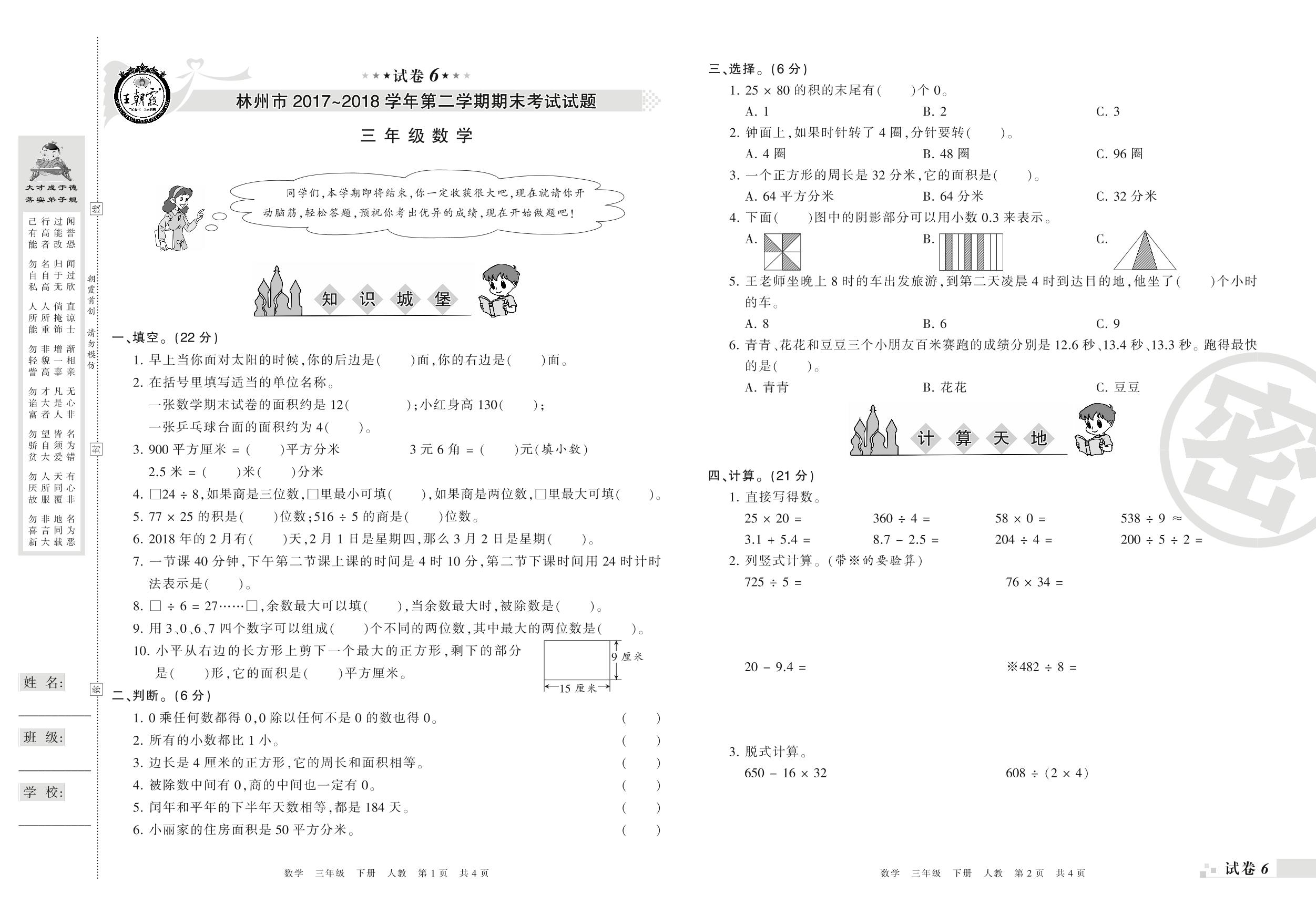 2017-2018学年第二学期林州市三年级数学试卷(人教版)【6】