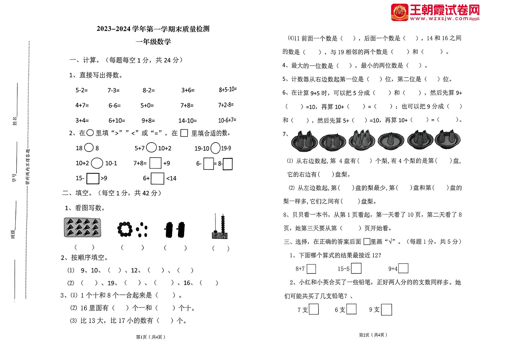 河南省洛阳市偃师区2023-2024学年第一学期期末质量检测试题一年级数学(苏教版)