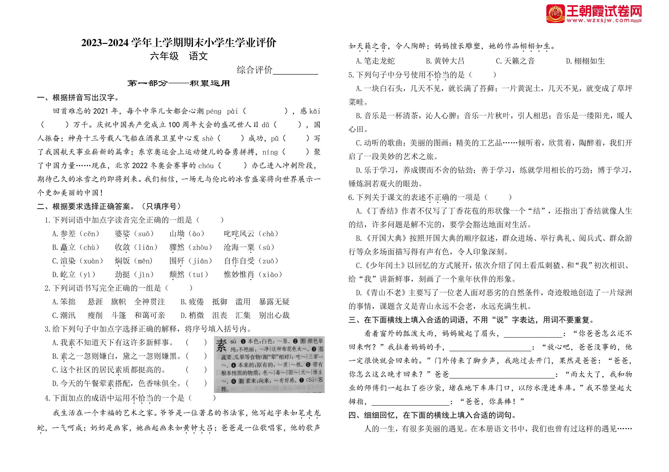 河南省商丘市睢县2023-2024学年上学期期末小学学业评价试卷六年级语文(人教版)