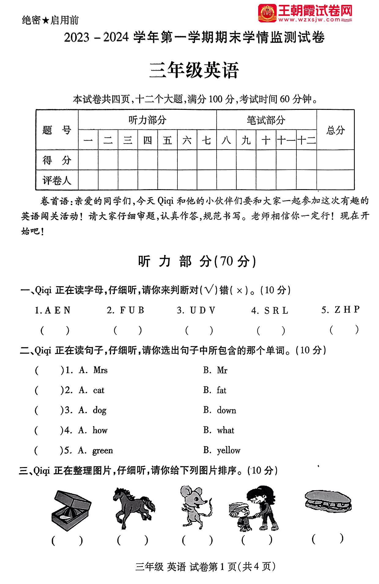 河南省洛阳市伊滨区2023-2024学年第一学期期末学情质量监测试卷三年级英语(科普版)【无听力音频】