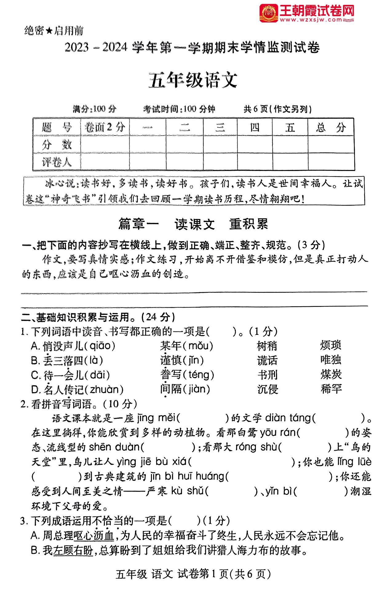 河南省洛阳市伊滨区2023-2024学年第一学期期末学情质量监测试卷五年级语文(人教版)