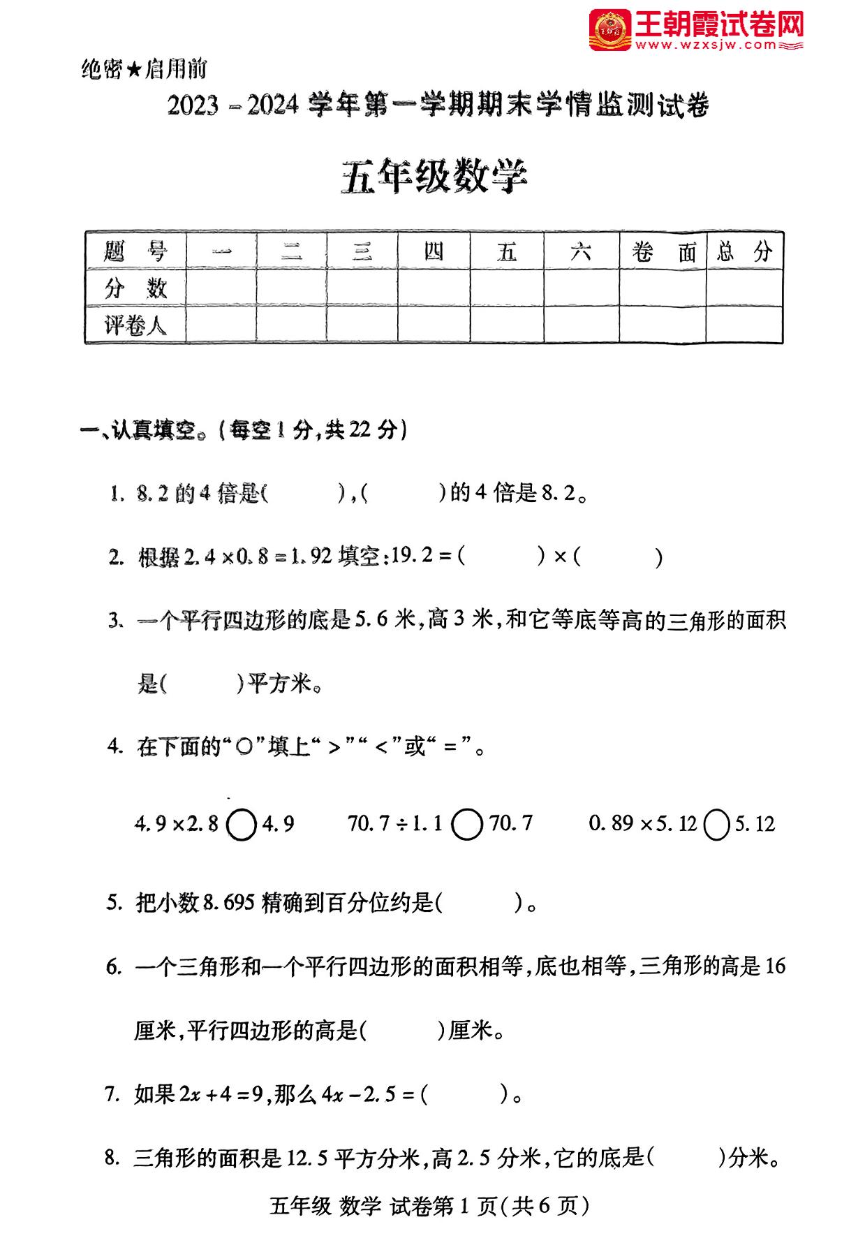 河南省洛阳市伊滨区2023-2024学年第一学期期末学情质量监测试卷五年级数学(人教版)