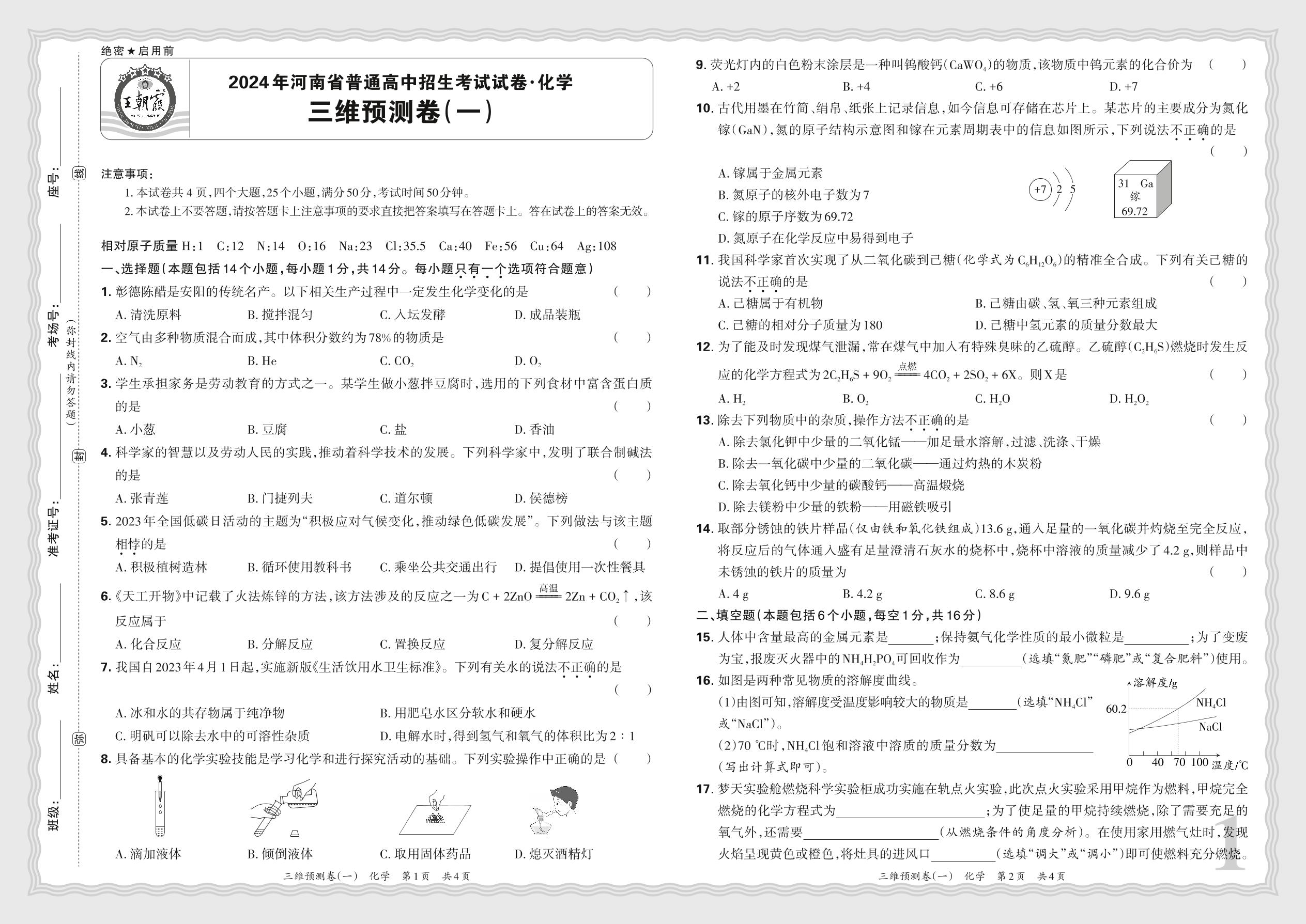 2024年河南省普通高中招生考试试卷·化学 三维预测卷(一)