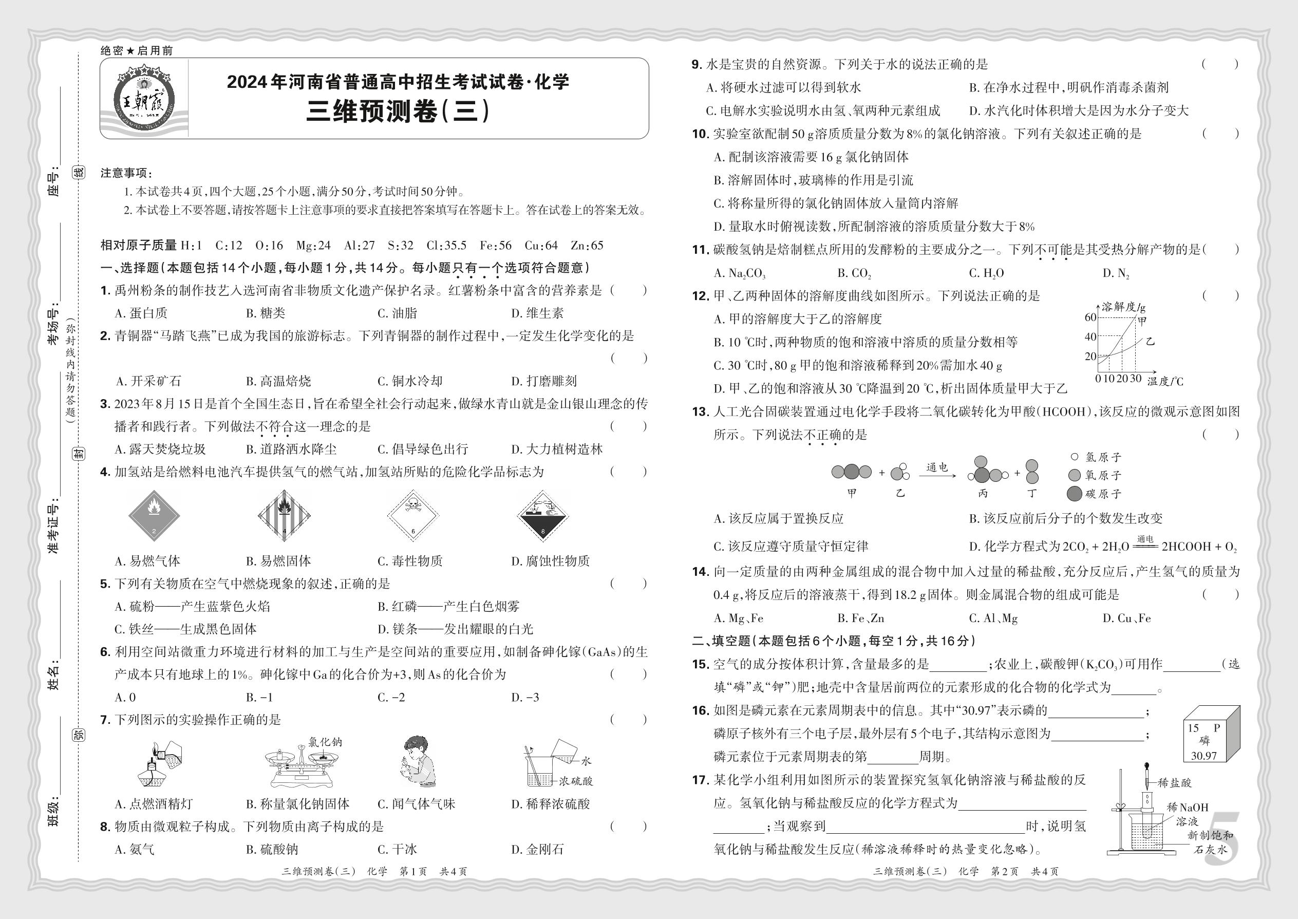 2024年河南省普通高中招生考试试卷·化学 三维预测卷(三)