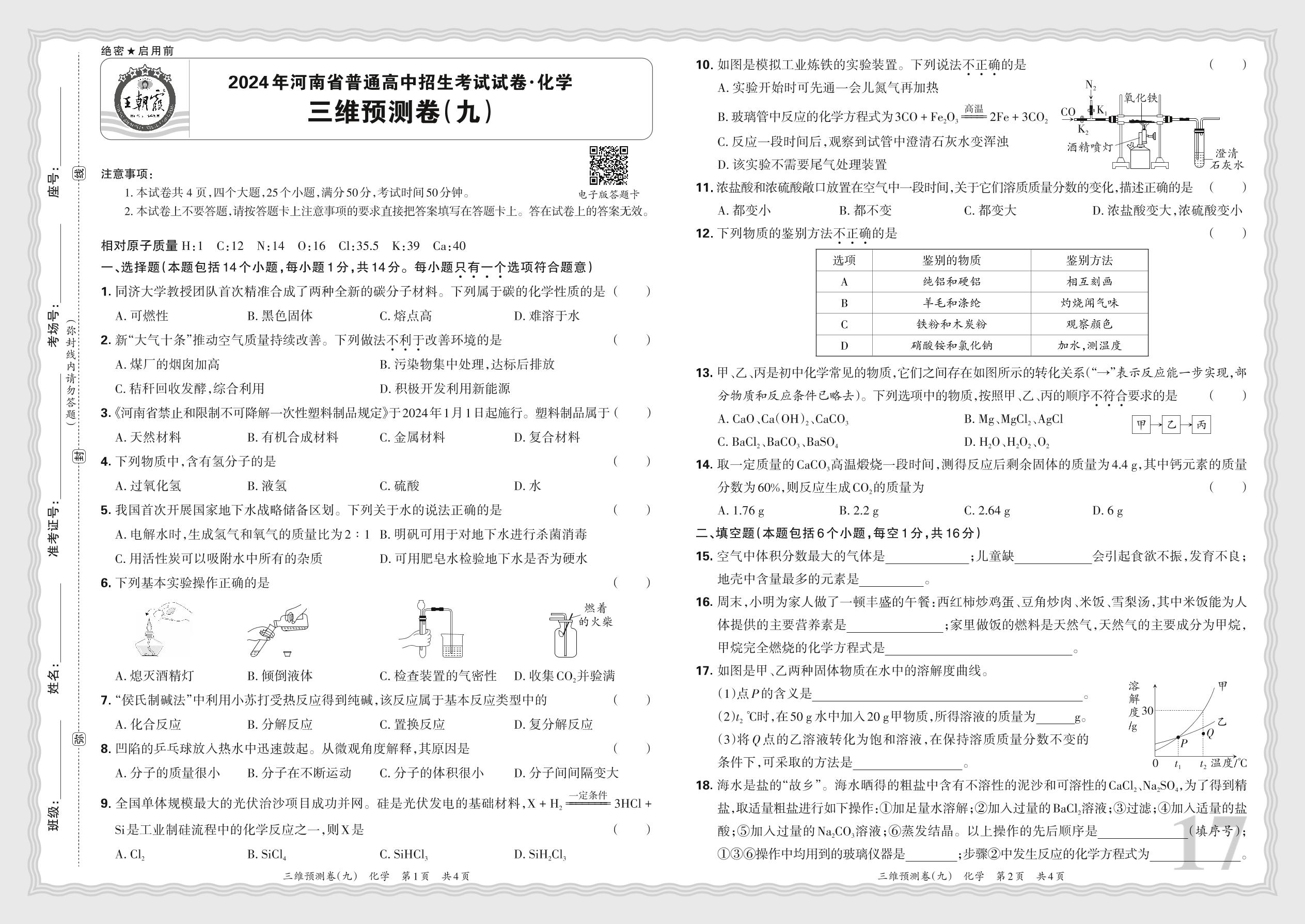 2024年河南省普通高中招生考试试卷·化学 三维预测卷(九)